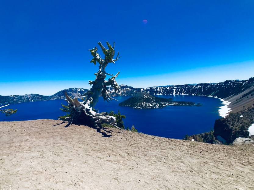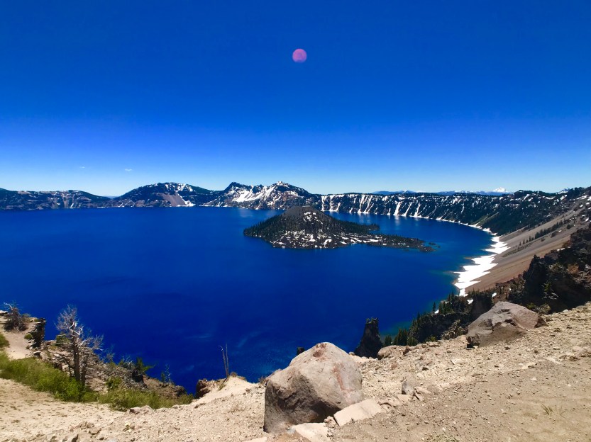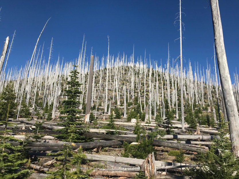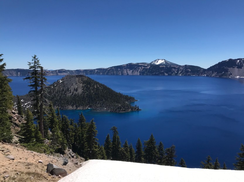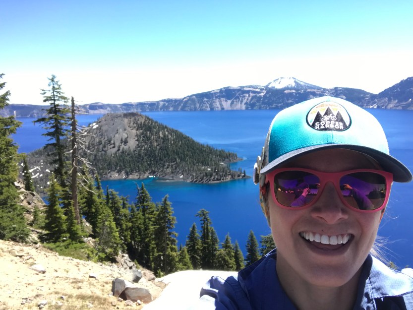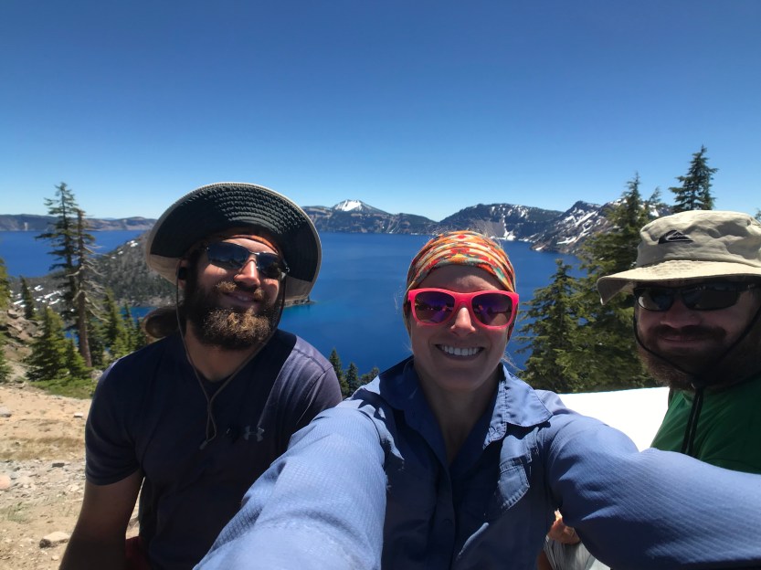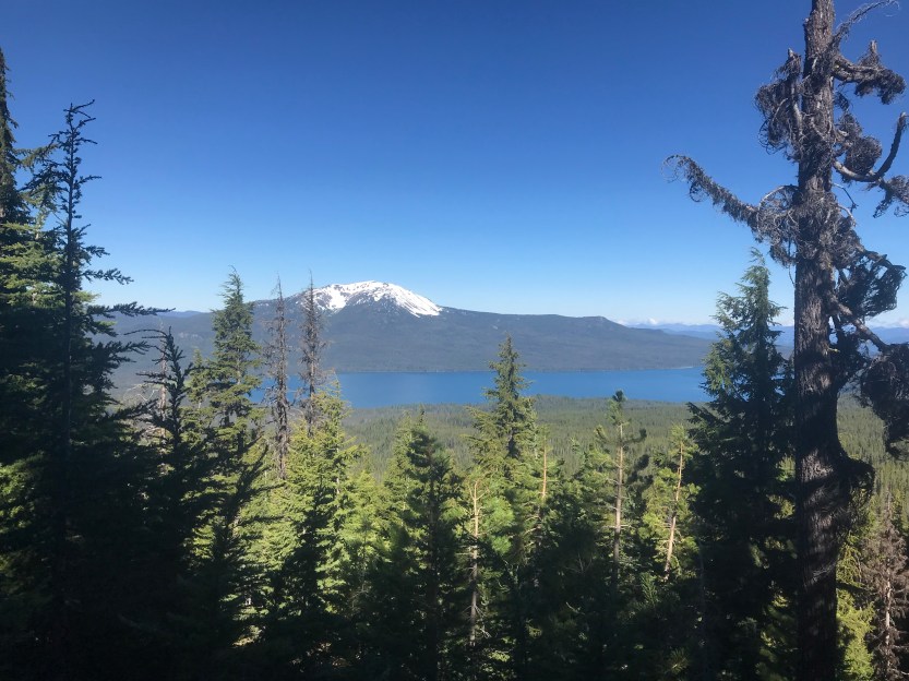 Day 64: 17 miles hiked. We woke up and walked back up to Crater Lake from our campsite. As we approached the lake, I saw that the color had changed to be an even deeper shade of blue than the day before. “Whoa!” I exclaimed and Beast and Savior nodded in agreement. We made our way around the lake, admiring it from all the viewpoints along the way. The PCT is an equestrian trail and doesn’t actually go around the lake because no horses are allowed on the rim of the lake (it goes through the national park land, but if you stay on trail, you’d never see the lake!), so we took an alternate route as we didn’t want to miss it! While at the viewpoints we had several people offer up trail magic, by way of pineapple slices and spare bananas. After many an hour hanging out admiring the view (and eating alllll of the fresh fruit), we finally made our way back to the official PCT. We got a ride to the parking lot where it met back up, and as we were trying to get organized to start walking, two people pulled in and offered us some more trail magic! They had just finished their own PCT section hike, and gave us some grapes and took our trash. I have to say, I generally hate taking out the trash in real life, but now throwing away trash that I would otherwise have to carry around is one of my most satisfying chores. We said goodbye to the angels and started to make our way to Mt. Thielson, our next adventure. We were in the middle of a dry stretch, and as we crossed a dirt road, we were happy to find a water cache. We sat and ate dinner at the cache before heading back into the woods to camp for the night. It was around this point that the 3 of us realized we shouldn’t hike together, because if we did, we’d have to walk in someone else’s cloud of mosquitoes that were following them. As the sun began to set, the hoards began to worsen and we took refuge in our tents after a quick setup.