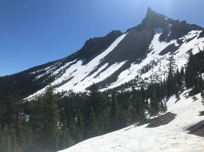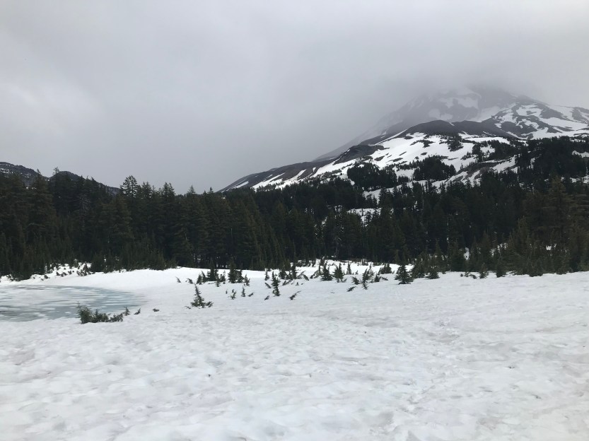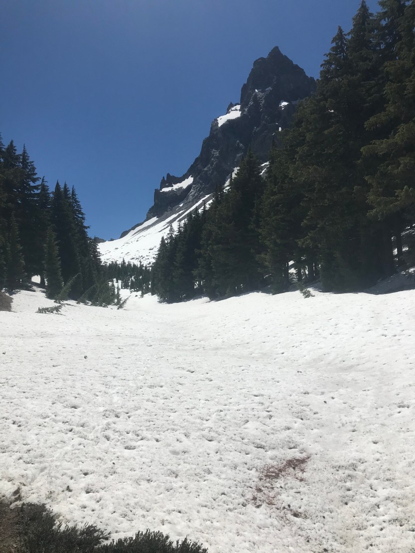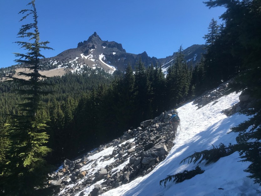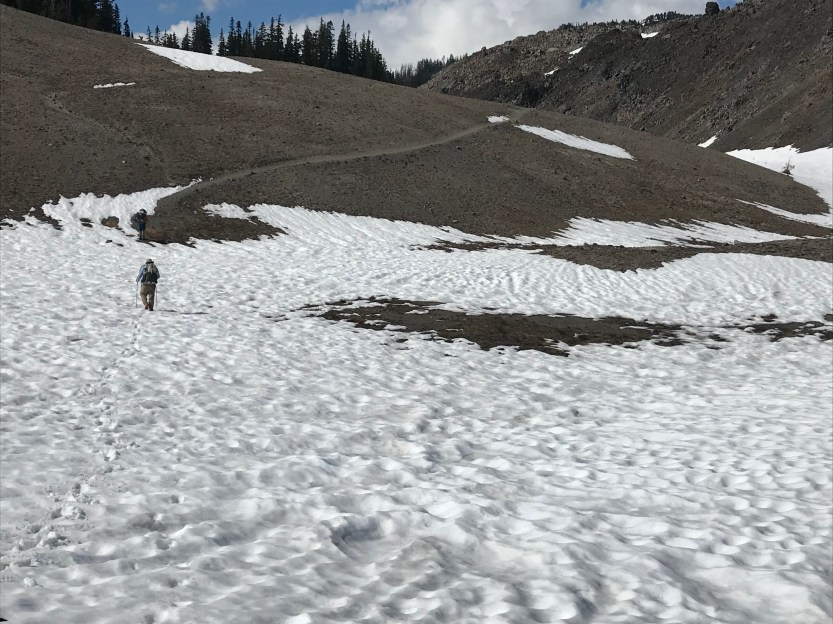 Day 65: 16 miles hiked. I woke and saw the mosquitoes were gone, “what good fortune!” I naively thought. As I started to pack, a nice solid layer of mosquitoes began to cling to the netting around my tent, as if they could sense my imminent danger. I resigned myself to hiking in my rain gear and headnet for the remainder of the PCT so that I would avoid the terrible fate of death by blood loss due to mosquito. As we began our climb around Mt. Thielson, the snow picked up and the mosquitoes thankfully lessened (I’m not sure I could’ve handled the mental challenge of both slippery snow hiking and mosquito dive bombs). We navigated our way through snow fields and around snow boulders as we climbed around the base of the mountain. This was an extremely challenging day, as almost all of it was spent on snow. Snow hiking is difficult, especially when one foot is in slush (the sun), and the next is on ice (the shade). It makes it hard to constantly be balanced, and I was happy that we were doing this sort of hiking in Oregon, where the trail is relatively flat. Even with the added traction of my micro spikes (which we put on about an hour into the day, and didn’t take off until 30 minutes before camp), I was still slip sliding around, and fell so often, I can no longer remember how many times I slammed my elbow into the ice. Additionally, the trail was always on the western edge of the mountain, so my right leg (which was always my uphill leg) was getting much more of a work out than my left, and my right elbow was paying the price for every slip. We walked along the base of Mt. Thielson, and saw a really cool, and yet eerie avalanche path, where all of the trees were broken 2-3 feet from the ground, and were just laying next to their broken stumps. After what seemed like forever, we made our way around Mt. Thielson, and found our way to the next water source. We were at the end of a 20 mile carry for water, and we were all out of water by the time we got to lunch. We found the spring, but it was covered in several feet of snow and ice. Having had such a bad time melting snow just a few days prior, we were very hesitant to melt some more. The melting of snow had ruined 2 of our 3 water filters (they now permanently tasted of smoke, no matter how much we tried to clean them out), and we didn’t want to ruin the last one! We walked along what was clearly the flow path of the spring for about 200 yards, hoping that our feet would break through, but it was still too deeply covered with ice and snow. We were all mentally and physically tired at this point, so we decided to take eat lunch on some nearby boulders while we figured out what to do. We saw a low point for the spring path, and I made my way over to it with my ice axe, in the hopes that I could dig for only a little bit and find some of that liquid gold. After one swing, I could see and hear it! I continued to dig so we could fit Beasts water bag in it, and then we spent the remainder of our break filtering water for everyone. Beasts filter was going rather slow, so it actually took several hours for us all to get water! We continued onward, in the hopes of getting up and over the Oregon highpoint before dark. This was one of the more difficult days on trail. There was a lot of uphill slogging through snow. With every step we took, we’d slide back a half step, so progress was extremely slow going and very tiring. Additionally, the trail was completely covered in snow, so we were constantly getting lost and having to check ourselves on our GPS devices (we found out later that 3 people had to be rescued in the 4 days after us because they all got lost in the snow fields and ended up in precarious situations). We eventually made it to the high point, but we were all mentally and physically drained by this time. From here it was all downhill, which in someways is harder in the snow because you’re slipping everywhere. We developed a sort of ski maneuver, where we’d plant our poles and slide our way down the mountain. Many falls occurred during this as well, but hey! at least the mosquitoes were mostly gone! We eventually got down far enough on the mountain that we could mostly walk on the ground. We were soaked by the time we got to camp because of all of the slush, and we had to make a campfire to dry off our socks and shoes (the first of many times). At least there was snow everywhere, so we could put out the fire easily! 😂