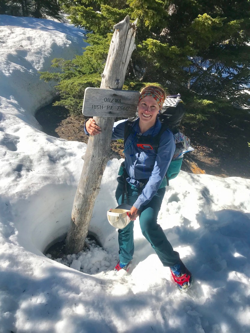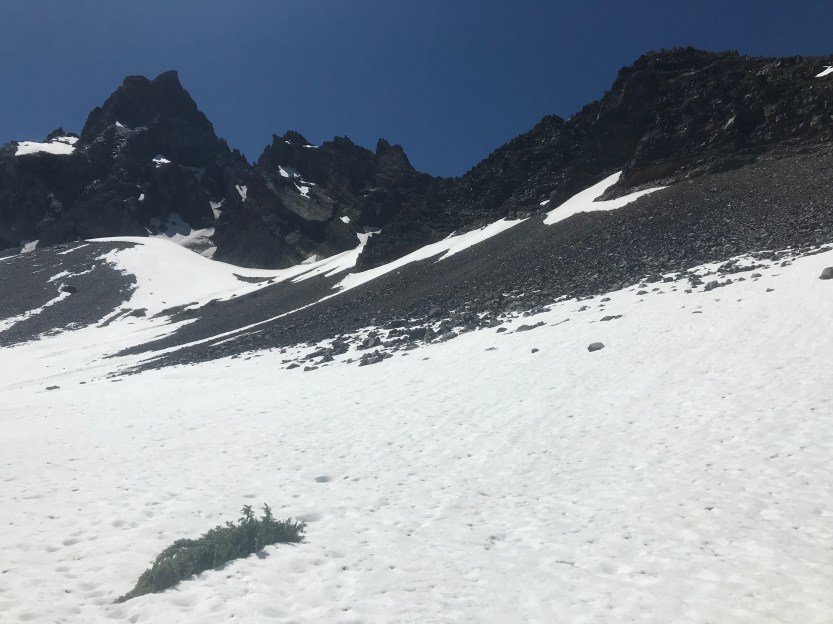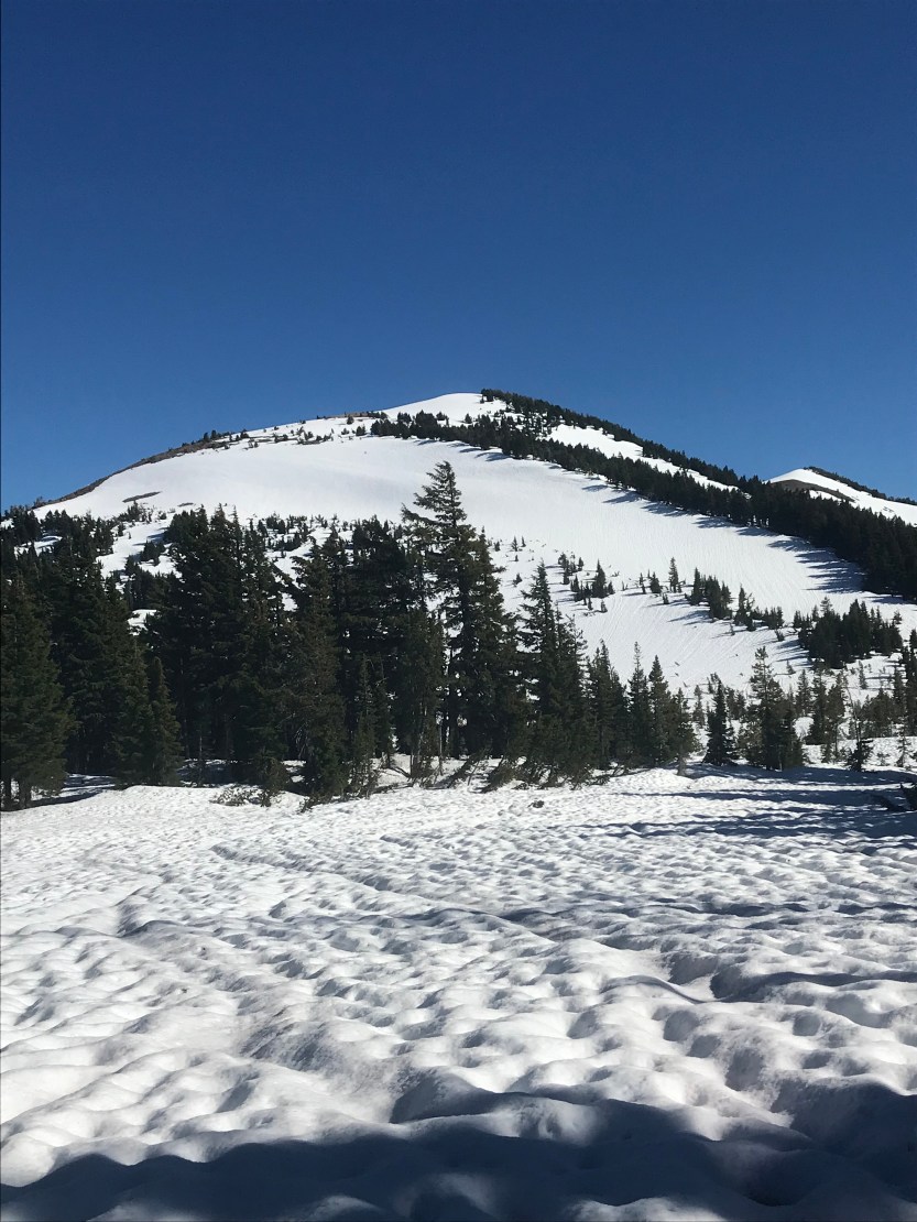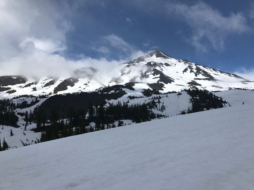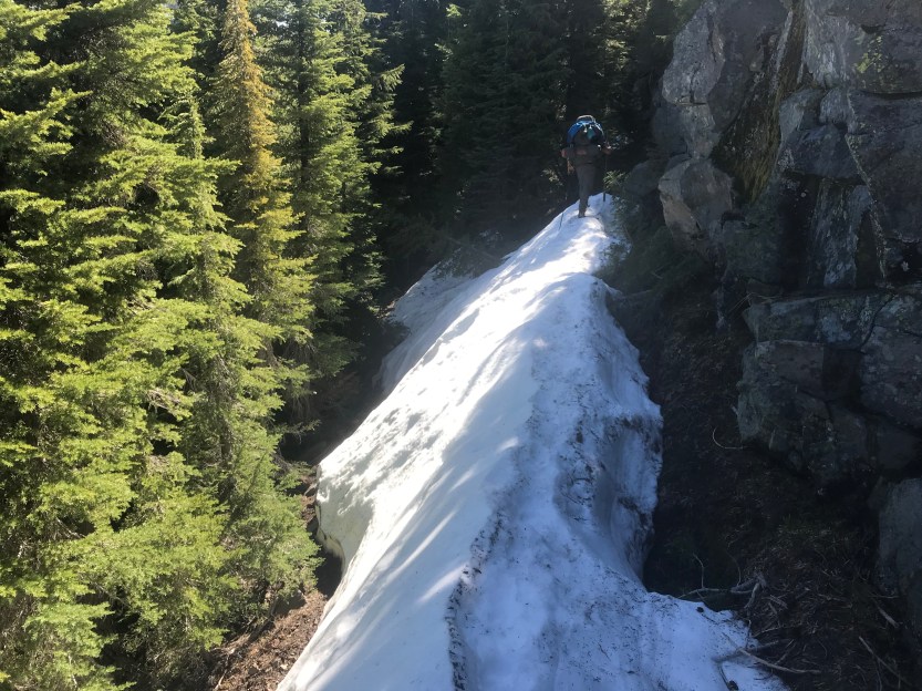 Day 65: 16 miles hiked. I woke and saw the mosquitoes were gone, “what good fortune!” I naively thought. As I started to pack, a nice solid layer of mosquitoes began to cling to the netting around my tent, as if they could sense my imminent danger. I resigned myself to hiking in my rain gear and headnet for the remainder of the PCT so that I would avoid the terrible fate of death by blood loss due to mosquito. As we began our climb around Mt. Thielson, the snow picked up and the mosquitoes thankfully lessened (I’m not sure I could’ve handled the mental challenge of both slippery snow hiking and mosquito dive bombs). We navigated our way through snow fields and around snow boulders as we climbed around the base of the mountain. This was an extremely challenging day, as almost all of it was spent on snow. Snow hiking is difficult, especially when one foot is in slush (the sun), and the next is on ice (the shade). It makes it hard to constantly be balanced, and I was happy that we were doing this sort of hiking in Oregon, where the trail is relatively flat. Even with the added traction of my micro spikes (which we put on about an hour into the day, and didn’t take off until 30 minutes before camp), I was still slip sliding around, and fell so often, I can no longer remember how many times I slammed my elbow into the ice. Additionally, the trail was always on the western edge of the mountain, so my right leg (which was always my uphill leg) was getting much more of a work out than my left, and my right elbow was paying the price for every slip. We walked along the base of Mt. Thielson, and saw a really cool, and yet eerie avalanche path, where all of the trees were broken 2-3 feet from the ground, and were just laying next to their broken stumps. After what seemed like forever, we made our way around Mt. Thielson, and found our way to the next water source. We were at the end of a 20 mile carry for water, and we were all out of water by the time we got to lunch. We found the spring, but it was covered in several feet of snow and ice. Having had such a bad time melting snow just a few days prior, we were very hesitant to melt some more. The melting of snow had ruined 2 of our 3 water filters (they now permanently tasted of smoke, no matter how much we tried to clean them out), and we didn’t want to ruin the last one! We walked along what was clearly the flow path of the spring for about 200 yards, hoping that our feet would break through, but it was still too deeply covered with ice and snow. We were all mentally and physically tired at this point, so we decided to take eat lunch on some nearby boulders while we figured out what to do. We saw a low point for the spring path, and I made my way over to it with my ice axe, in the hopes that I could dig for only a little bit and find some of that liquid gold. After one swing, I could see and hear it! I continued to dig so we could fit Beasts water bag in it, and then we spent the remainder of our break filtering water for everyone. Beasts filter was going rather slow, so it actually took several hours for us all to get water! We continued onward, in the hopes of getting up and over the Oregon highpoint before dark. This was one of the more difficult days on trail. There was a lot of uphill slogging through snow. With every step we took, we’d slide back a half step, so progress was extremely slow going and very tiring. Additionally, the trail was completely covered in snow, so we were constantly getting lost and having to check ourselves on our GPS devices (we found out later that 3 people had to be rescued in the 4 days after us because they all got lost in the snow fields and ended up in precarious situations). We eventually made it to the high point, but we were all mentally and physically drained by this time. From here it was all downhill, which in someways is harder in the snow because you’re slipping everywhere. We developed a sort of ski maneuver, where we’d plant our poles and slide our way down the mountain. Many falls occurred during this as well, but hey! at least the mosquitoes were mostly gone! We eventually got down far enough on the mountain that we could mostly walk on the ground. We were soaked by the time we got to camp because of all of the slush, and we had to make a campfire to dry off our socks and shoes (the first of many times). At least there was snow everywhere, so we could put out the fire easily! 😂