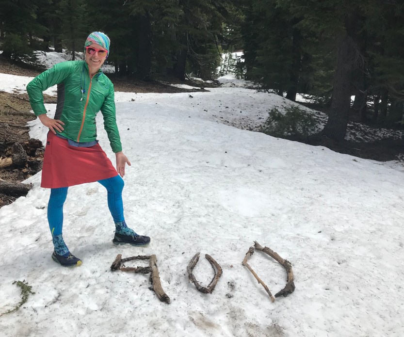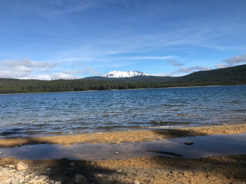 Day 67: 20 miles hiked. I woke up with soooooo much motivation to get to Shelter Cove resort. I had heard that their burgers were spectacular, and we had had no good food to speak of for 11 days very long days. I was incredibly happy that we had opted for the OST! I counted steps on snow for the day: 19! There were lakes everywhere, some of which offered a view of diamond peak, where the PCT went around. It looked snowy, so I was grateful to be on the ground. We also got to walk next to a raging river, with waterfalls along the way for the last 6 or so miles, and it was a great change of scenery from the snowcaps we had spent the last several days navigating around. We got into Shelter Cove, and I was happily surprised to see our friends Oreo and Sunshine (who we’d met at Crater Lake)! I inhaled an amazing burger, caught up with everyone, resupplied, and did all of the chores. It was a great stop in town, and I vowed to come back and have fun at this resort sometime when I wasn’t trying to hike crazy mileage. Oreo and Sunshine met a woman named Bookworm, and the three of them headed out, while we promised to try and catch them later that night. We were waiting for our laundry to finish when another person, Starr Baby, came in and we chatted over some beers. It was so nice to see and meet new people! Savior, Beast, and I have mostly been all on our own since we started in Oregon, and it was great to chat with some new people and hear some new stories! Eventually our chores were finished, and we hiked out of the resort, determined to catch up with our friends. We did find them, but it was after dark, and they were all sleeping by the time we arrived (thru-hikers are usually sleeping by 8 or 9pm). Nevertheless, I was pretty proud of us: we had managed to hike 20 miles, while doing a full resupply and all of our chores too! This is what we call a hero (minimum of 20 miles, and all chores done too), and it was the first time we had managed to accomplish it!