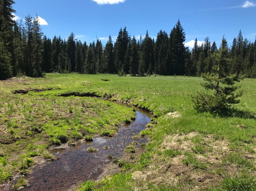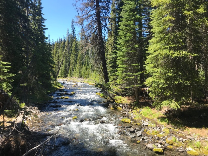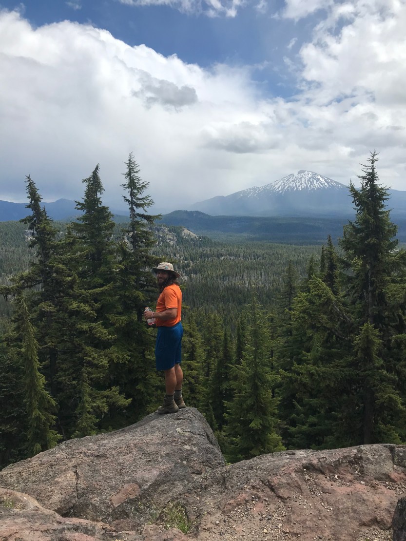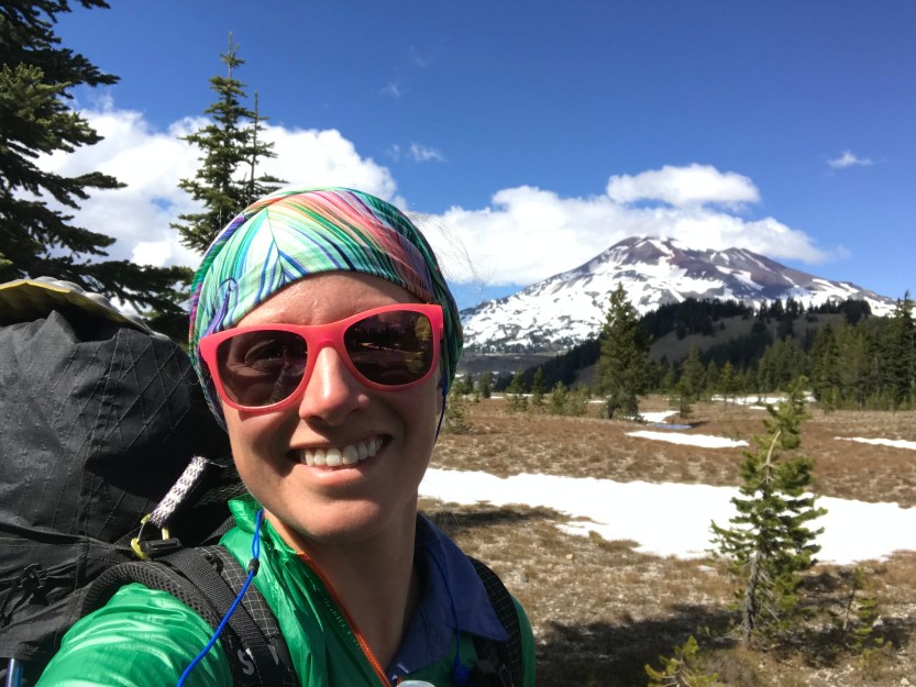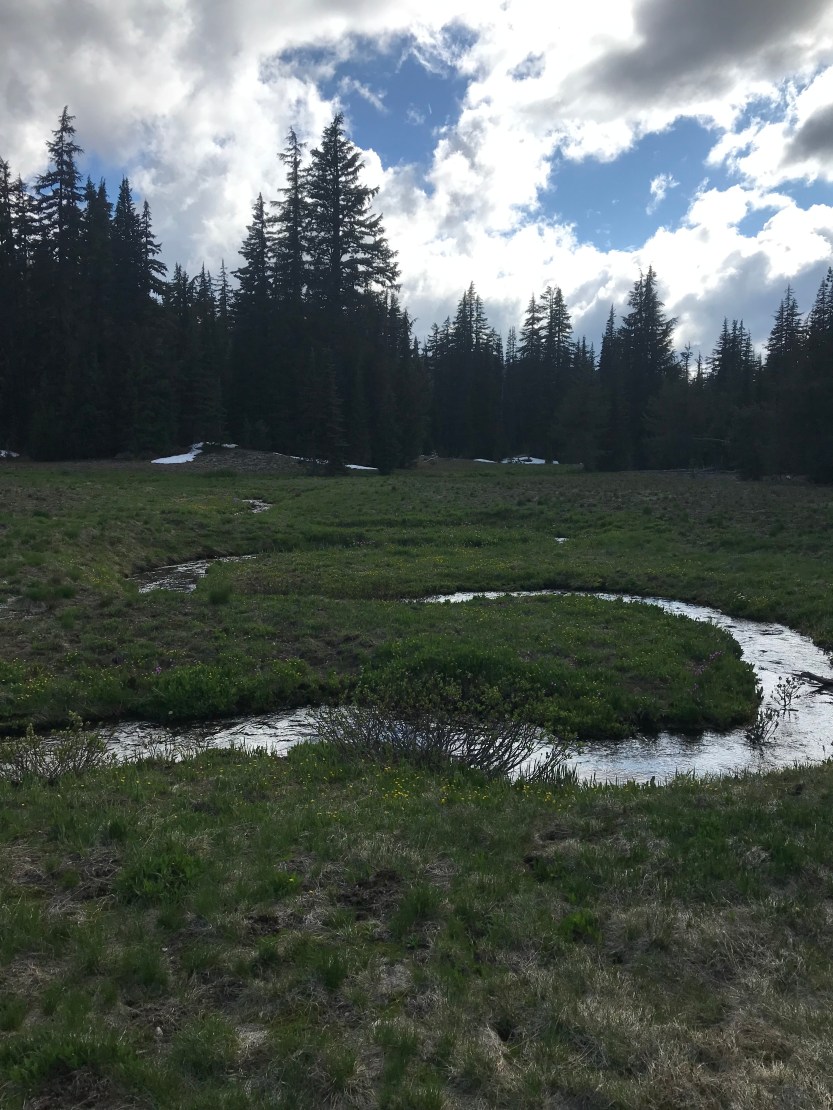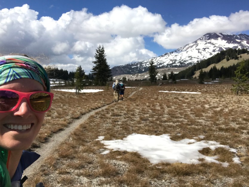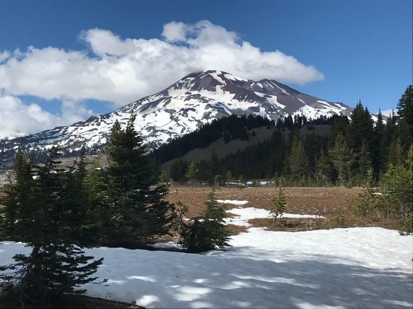 Day 69: 24 miles hiked. We said goodbye to Starr Baby for good in the morning, as he was going to push on while we went into town. We were 24 miles away from Elk Lake Resort, where we had arranged to have my brother, Jordan, come and pick us up. We were all motivated to get to the resort, as we were going to take our first zero in Oregon! We left in the cold of the morning, and literally 200 yds into the hike, we saw a sign that Oreo and Sunshine drew to point us to their campsite… we were so close, yet we still missed them! 😩 As we hiked along, we were met with on/off snow on the ground. It was difficult to hike through, but we were so motivated to take a day off, that we still managed to get 20+ miles in for the day. We stopped at a series of several lakes for all of our breaks, including my favorite lake so far, Dumbbell Lake! The first lake was freezing cold, the second lake was warmer, but full of mosquitoes, and the third lake was perrrrrfect! No mosquitos and warm and beautiful! Another place I could spend an entire day, if I had the time! We moved on, trying to hike fast enough to not be late in meeting Jordan. We passed by several meadows and fields with snowmelt rivers winding their way through them until we came out on a ridge where we saw Mount Bachelor off in the distance. From there it was all downhill into Elk Lake Resort, where we found Oreo and Sunshine camping out at the trail junction. We lamented about the fact that we kept missing each other, and tried to make plans to meet up when we all got back on trail. We found Jordan waiting for us at the resort, and had a beer to celebrate! Somehow we crammed all of our stuff and the 4 of us into his tiny Jetta, and made our way to Bend, where we were going to spend the next 2 nights. There’s an amazing Thai restaurant in town that we hit up and then we proceeded to pass out pretty quickly after getting to our AirBnB.