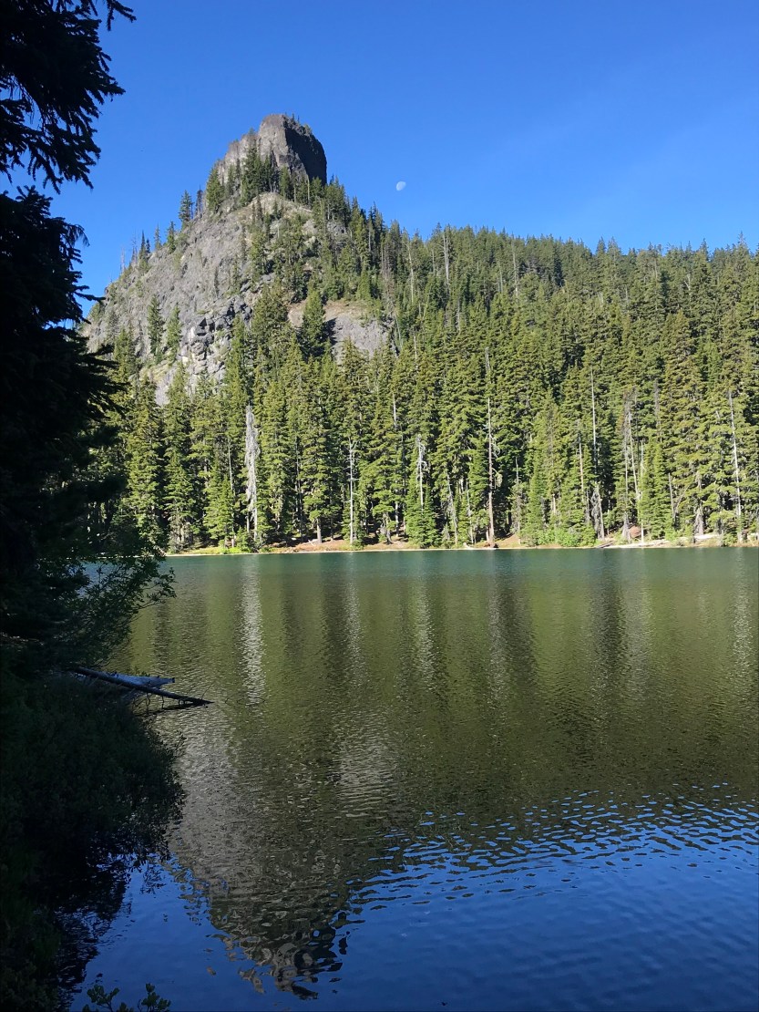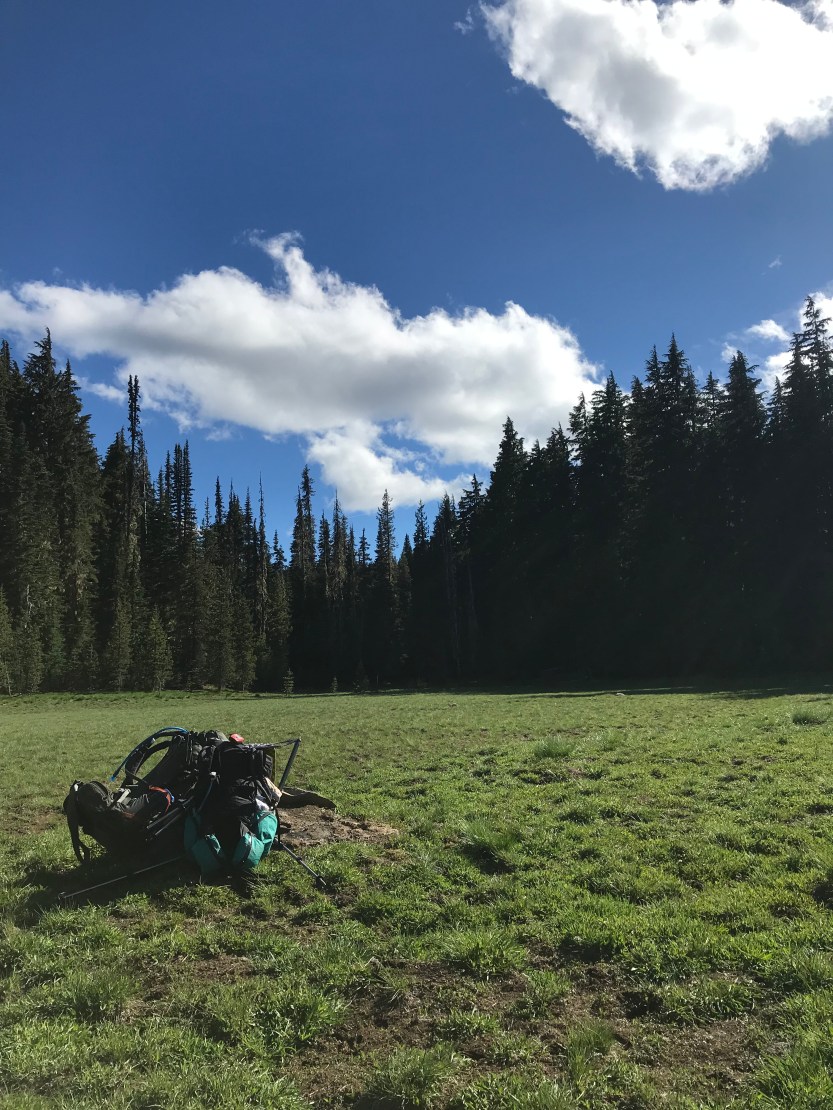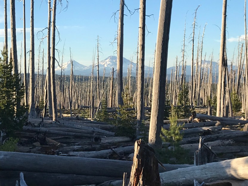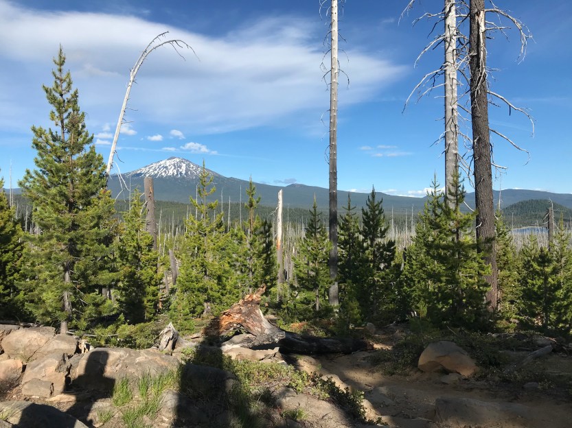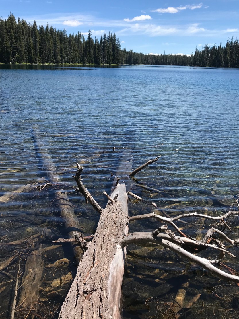 Day 68: 19 miles hiked. We were just starting to pack up, as Sunshine, Oreo, and Bookworm passed our campsite. We talked about where we thought we’d camp for the day, and made tentative plans to try and meet up again at night, this time hopefully before bedtime and then they headed off while we continued packing! We made our way to a shelter that is used by backcountry skiers during the winter. This was the first shelter that we’d seen along the trail, and it was quite the treat. It was a log cabin that smelled like and reminded me of our family’s cottage in the Upper Peninsula. Much of Oregon reminded me of the UP. There are trees and lakes everywhere (not to mention the mosquitoes and snow in June). It all made me a bit homesick, but also made me think of happy thoughts of my family. We ran into Starr Baby again at the shelter, and spent far too much time chatting the day away. Eventually we remembered that we shouldn’t take hours long breaks, and made our way to leave, with Starr Baby saying he’d catch up to us later. After leaving the shelter behind, we walked to Bobby Lake, where we had a great lunch. I really love all the lakes that Oregon has to offer! It basically means I can go for a swim anytime I want a break or get too sweaty. It also means I get to eat lunch on a lake, everyday. Unfortunately, all the water also means that all of these breaks come with swarms of the flying terrorists, but I’m just going to try to block that from my memory… As we continued on in our day, we ended up in another burn area. The burns are kind of nice, as it’s the only time that you can actually see off in the distance and what you’re hiking next to! It offered us our first glimpse of the Three Sisters which are volcanoes that we were going to hike along side in the next leg of the trip. We stopped for a break and Starr Baby caught back up to us. While we were resting, I made myself an electrolyte drink, and unfortunately, I didn’t wait enough time for the tab to dissolve before I drank it. As we started to hike again, I started to get dizzy and nauseous (the tabs were fizzing and dissolving in my stomach which was screwing with my ability to breath properly!) and I had to stop several times to restore balance. Savior and Starr Baby hiked on ahead in the hopes of getting out of the exposed sun, while Beast and I stayed behind until I could start walking again. We eventually came across some cell service, which was great because we needed to book a hotel or AirBnB for the next stop (Bend, OR). As we were walking, Beast was looking at hotels on his phone and stepped on the end of a dead branch. This branch flipped up and smashed in his knee, and which then started to gush blood everywhere! We eventually caught up to Starr Baby and Savior, who had stopped at the first campsite they came across in order to wait for us. I think we looked like a sorry sight, with Beast bleeding all over his leg, and me nonstop burping/desperately trying to not throw up. We decided to call it a night, despite the fact that the mosquitoes were even worse than normal (I renamed the lake Mosquito Hell Lake, since that was more accurate than Taylor Lake) because neither of us were in any shape to continue on!