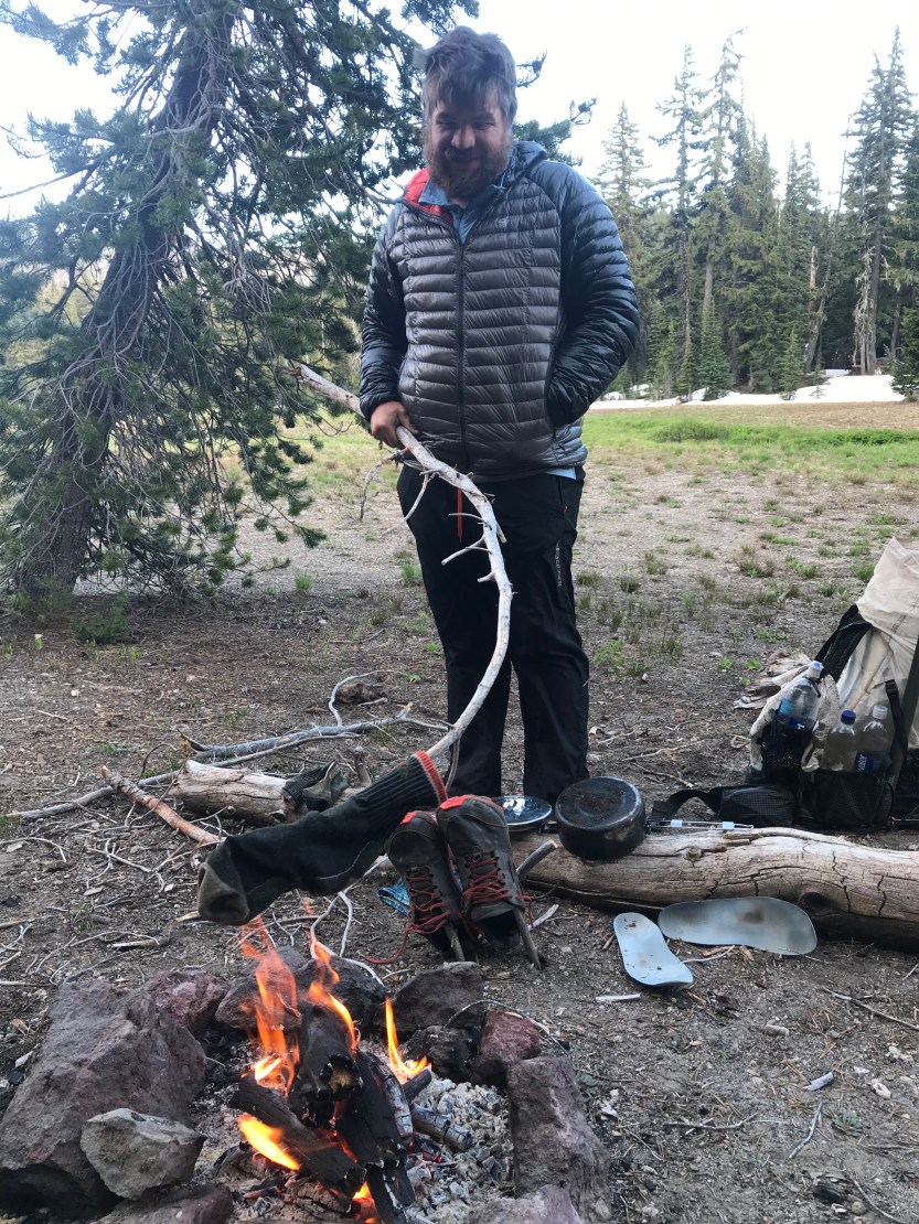 Day 71: 10 miles hiked. We finished up the last of our chores, and Jordan dropped us back off at Elk Lake. We knew that the upcoming section was going to have a lot of snow, and that it would be difficult to find places to camp that weren’t covered. We also knew that the snowfields were going to start to be really bad about 10 miles ahead of us, so we planned to only go 10 miles in order to avoid snow camping. I was having issues with getting a new credit card from one of my banks (this whole missing wallet thing turned out to be one giant headache…), so we stopped at Mirror Lake for several hours to eat lunch while I was on hold with them to try and get a new card. It eventually got all sorted out, and we continued on. As we made our way towards the Three Sisters (creatively named: South Sister, Middle Sister, and North Sister), we could see all sorts of mountains around and ahead of us, including Broken Top and Mount Bachelor. It was incredibly beautiful, and I was really excited for all of the scenery we were about to walk through. As we hiked along, we saw a lot of elk tracks, but no elk :(. We got to our campsite for the night and started a campfire to dry off all of our soaking gear that had gotten wet in the slush fields we had crossed earlier in the day.