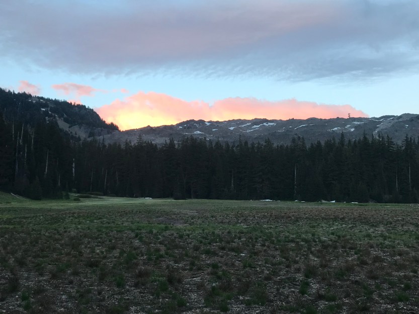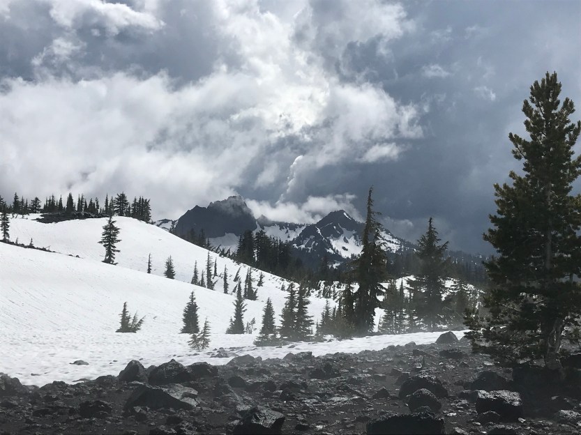Day 72: 9 miles hiked. We had planned to hike about 15 miles today, as we knew it would be slow going with all the upcoming snow. Things didn’t work out that way though, as we were waylaid by several storms throughout the day. As we left our campsite, we crossed a beautiful little stream that zigged and zagged all the way along the meadow. Almost immediately we were surrounded by a snow field that would only occasionally let up for the remainder of the day. After what seemed like an age, we crossed the 900 mile marker! Only 100 more miles until we reach 4 digits! As we continued hiking, thunder storms kept on rolling through, but the closest ones were a minimum of 15 miles away and they would dissipate after a few hours. We changed the routes that we would walk along, since the trail mainly went across wide open snow fields. The safest place to be in a lightning storm is not anywhere outside. In lieu of this option, squatting amongst trees, in an area of lots of trees, is one of the safer places to be, though it is still very unsafe. We took several breaks when the storms got closer, just so we could remain in the trees while the clouds rolled overhead. It was on and off raining on us all day as well, and the breaks were nice to get some shelter from that too! Eventually, it seemed like the storms had broken and we were in the clear, so we walked along a field, passing by Middle Sister. As we entered a limited area (no camping allowed), we could see another storm cloud coming in, though it looked like it too would miss us. Within 30 minutes, we realized this was not the case, and we hung out in some more trees to try and wait it out. This was by far the scariest thing I’ve encountered on trail! There was no pause between the lightning and the thunder, meaning the storm was directly overhead, and the trees we were in offered very little protection. I squatted out in the center of a triangle formed by three trees in the hopes that if one of them was struck, one of the other two would catch it instead of it falling on me. Somehow I had cell service in this area, and I began texting with my friends, Caitlyn and Dorothee, which helped to calm my nerves down a bit! At this point we were all soaked from the storm and shivering, and the best way to warm up is to start moving. Once the thunder was a few seconds behind the lightning, we decided to start walking again, in order to avoid the hypothermia that was rapidly approaching. About 2 minutes after we started walking again, the sky opened up and nickel-sized hail started to downpour all around us. We were still in the area where camping was expressly forbidden, but at this point it was a survival situation (in which case camping becomes legal). I couldn’t stop shivering and by then I hadn’t been able to feel my hands for several hours. There were only 2 ways to warm up: continue hiking (not possible in the bruising hail) or set up camp and dry off, so set up camp we did! Without thinking, I dove into my tent as soon as it was setup, which made the inside of my tent soaked. Note to self, take off wet clothes in my tent vestibule before leaping into my tent next time, regardless of if it’s hailing out. Everything I had was soaked, except for the stuff that needed to be kept dry in order to keep me alive. I spent forever trying to wick up the mess I made before I could get out of my wet clothes and unpack my dry stuff. It took so long because I moving slow with how cold I was, and my fingers were barely functioning! Eventually I got dry, changed clothes, and ate some soup, which made me feel infinitely better! I had hoped that the storm would pass and we could pick up camp and move out of the no camping area, but I fell asleep as I waited for it to let up.