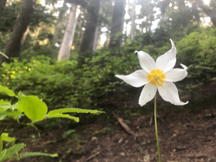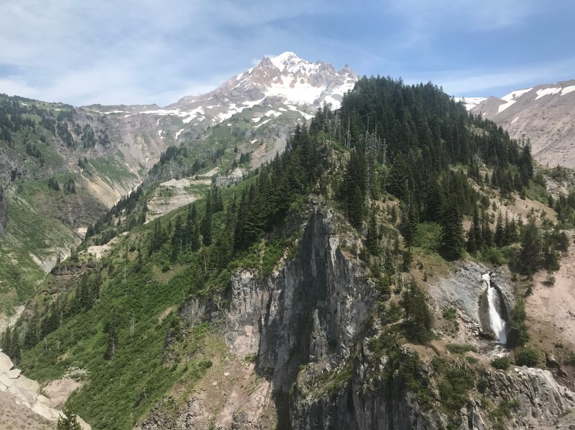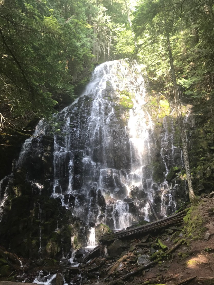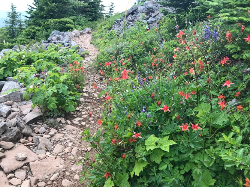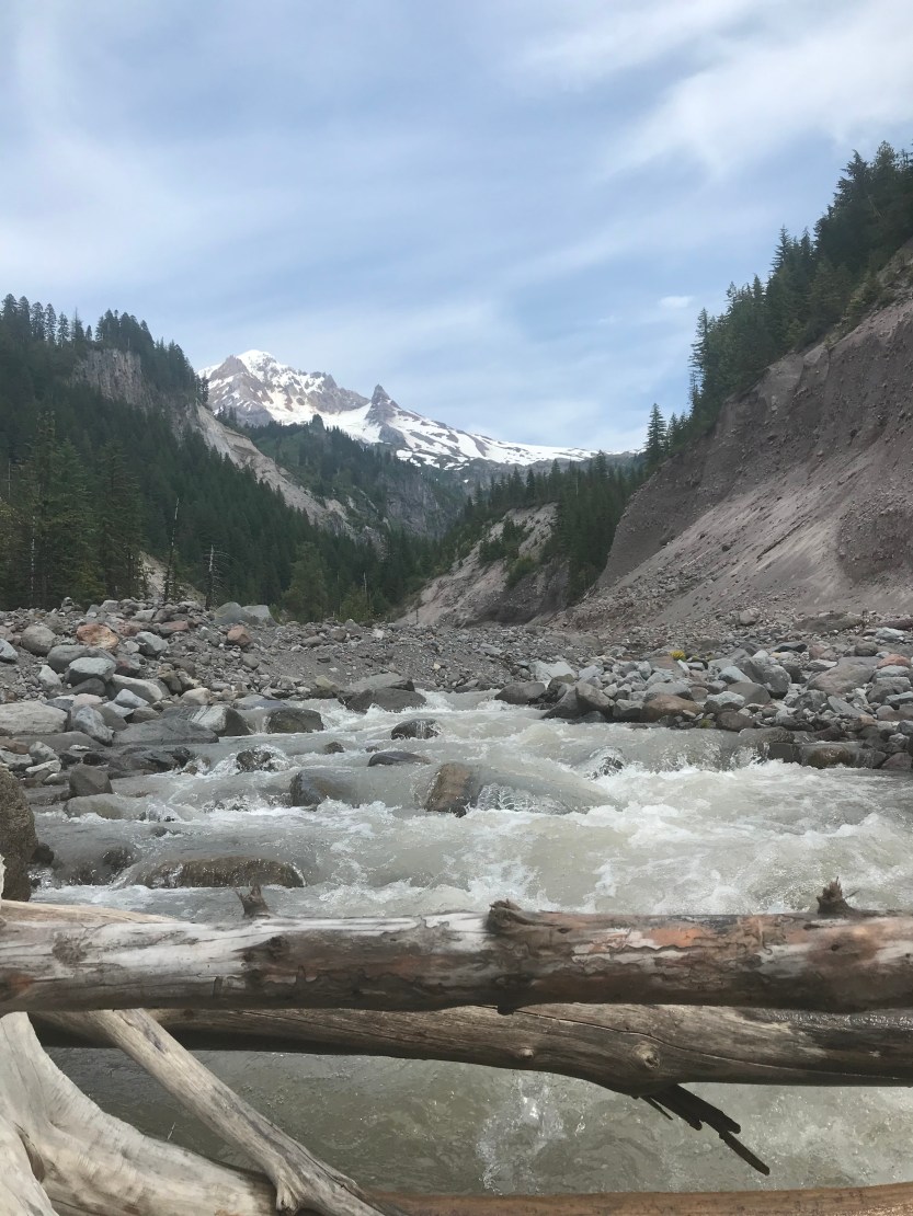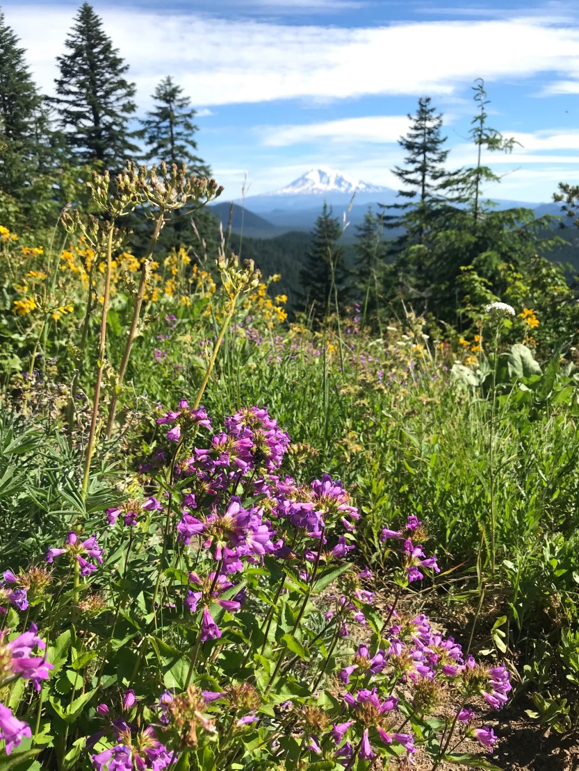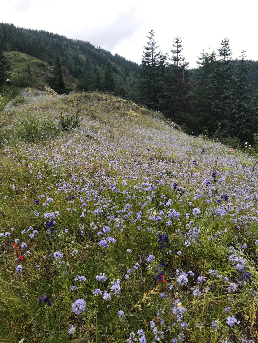 Day 81: 15 miles hiked. I specifically ate very little for dinner in the hopes that I could eat more breakfast today. Not sure it worked, but I definitely was up for the all you could eat challenge! The breakfast was delicious and amazing! Timberline Lodge is pretty fancy, and I felt out of place in my hiker clothes. Additionally, it’s been such a wet spring/summer, that people were still skiing on Mt Hood in July! The Lodge is where they filmed the Shining, and they have a replica ax that you can check out for a bit. After stuffing ourselves, we each took our ax pictures, before heading out to walk. It was an odd start to the day, with chairlifts and skiers all around us. We were walking in areas where the snow had only just melted, so the trail was muddy, but also filled with avalanche lilies, that like to be the first flowers to come out in the snowmelt! We saw many a waterfall today (both near and far), with the streams running strong with all the melted snow. At one point we stopped by a swollen river for a break, and were surrounded by butterflies! We also had a couple of crossings over rivers from glacier run offs. The glacial streams are all milky looking from all the silt in them, and FREEZING cold. After crossing one of them, we all soaked our sore feet for a bit before continuing on. I could only stand to keep my toes in for a few seconds at a time, it was that cold! Towards the end of our day, we took a side trail to see Ramona falls. This was a beautiful waterfall, but it was completely packed with day hikers everywhere. Holiday weekends make me claustrophobic! As we were walking back to the trail, I stepped on a golfball sized rock, and my ankle snapped to the outside. It’s the same ankle that I rolled in the desert, and this time was much much worse. I felt a pop and shooting pains up and down my foot and ankle. We pulled over and took a small break, trying to decide what to do. I could still walk, so I decided we should try to make our way (albeit slowly) to a campsite a few miles away that was supposed to offer up great views of Mount Hood. As we walked towards camp, a cloud came in, obscuring any views, but we were surrounded by wildflowers, so I was okay with it! My ankle was in pain, but I was taking it slowly in the hopes of not over doing it.