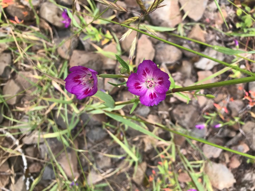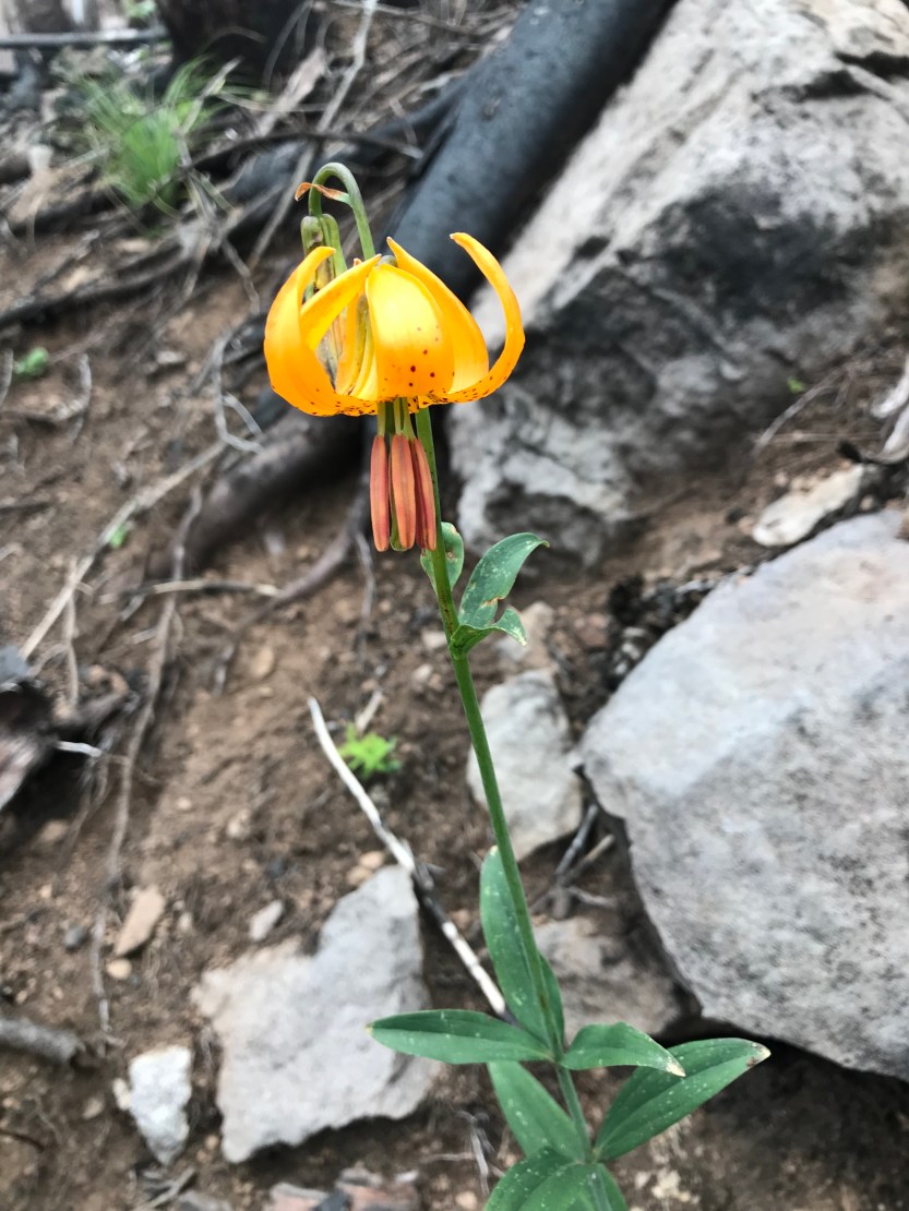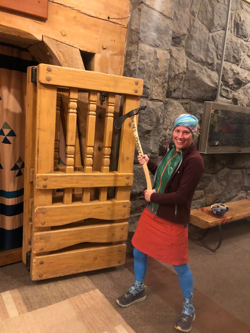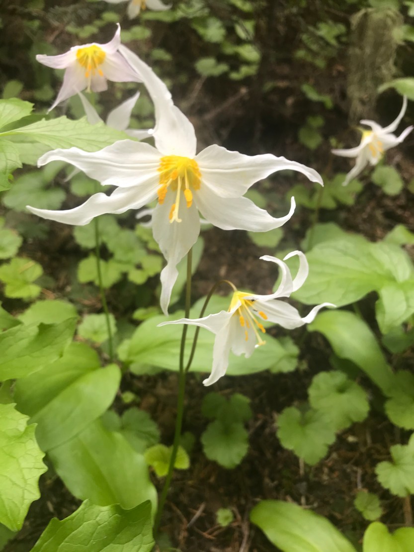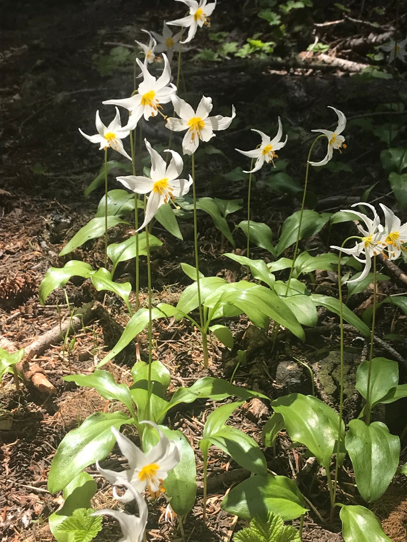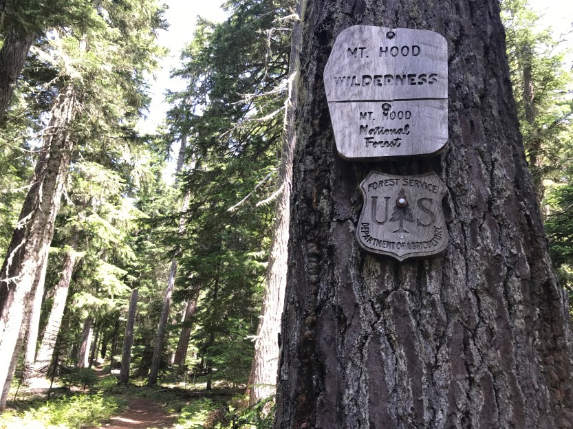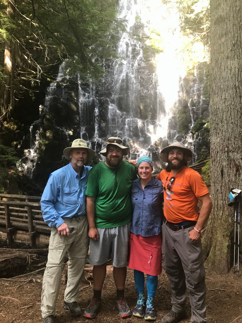 Day 81: 15 miles hiked. I specifically ate very little for dinner in the hopes that I could eat more breakfast today. Not sure it worked, but I definitely was up for the all you could eat challenge! The breakfast was delicious and amazing! Timberline Lodge is pretty fancy, and I felt out of place in my hiker clothes. Additionally, it’s been such a wet spring/summer, that people were still skiing on Mt Hood in July! The Lodge is where they filmed the Shining, and they have a replica ax that you can check out for a bit. After stuffing ourselves, we each took our ax pictures, before heading out to walk. It was an odd start to the day, with chairlifts and skiers all around us. We were walking in areas where the snow had only just melted, so the trail was muddy, but also filled with avalanche lilies, that like to be the first flowers to come out in the snowmelt! We saw many a waterfall today (both near and far), with the streams running strong with all the melted snow. At one point we stopped by a swollen river for a break, and were surrounded by butterflies! We also had a couple of crossings over rivers from glacier run offs. The glacial streams are all milky looking from all the silt in them, and FREEZING cold. After crossing one of them, we all soaked our sore feet for a bit before continuing on. I could only stand to keep my toes in for a few seconds at a time, it was that cold! Towards the end of our day, we took a side trail to see Ramona falls. This was a beautiful waterfall, but it was completely packed with day hikers everywhere. Holiday weekends make me claustrophobic! As we were walking back to the trail, I stepped on a golfball sized rock, and my ankle snapped to the outside. It’s the same ankle that I rolled in the desert, and this time was much much worse. I felt a pop and shooting pains up and down my foot and ankle. We pulled over and took a small break, trying to decide what to do. I could still walk, so I decided we should try to make our way (albeit slowly) to a campsite a few miles away that was supposed to offer up great views of Mount Hood. As we walked towards camp, a cloud came in, obscuring any views, but we were surrounded by wildflowers, so I was okay with it! My ankle was in pain, but I was taking it slowly in the hopes of not over doing it.