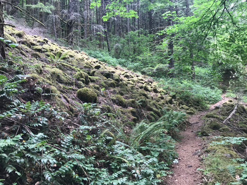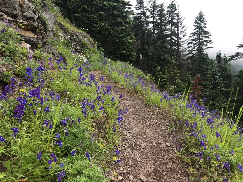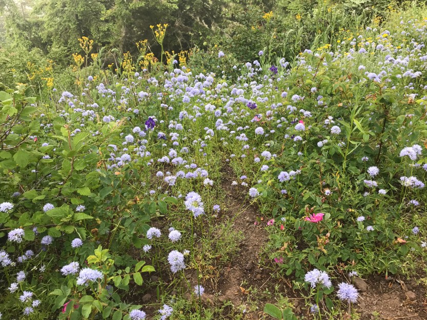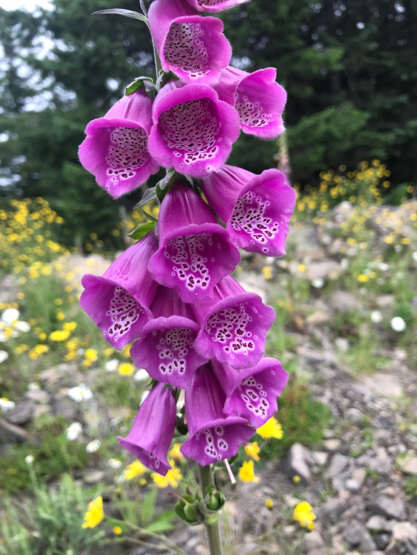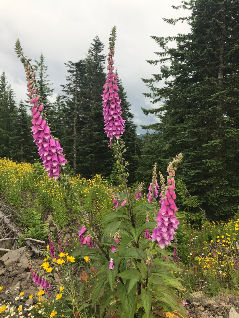 Day 86: 13 miles hiked. It was complete downpour when I woke up at the agreed upon wake up time. I decided that everyone could walk out without me if they wanted, I wasn’t going outside in the rain. It turns out, everyone else felt the same, and we all slept in until 10, when the rain finally subsided. Beast made us all breakfast burritos, and we all finally left camp around 11. We continued our hike uphill in the rainforest and we were surprised to see that the trail went missing several times. The brush got so dense in areas that the trail would disappear completely and I’d have to slowly edge my way forward because there were potholes on the trail that I didn’t want to fall into. I saw lots of flowers today, including foxglove for the first time. Savior is from Washington, and he had promised us that there was no way it was going to rain on us in Washington in July because it never rains during that month. My brother confirmed this when I talked to him, as did the section hiker from Washington that we met on the trail today (who didn’t even bring a rain jacket or a shelter with him, because it never, EVER rains in Washington in July). One of the things that got me through June, was that the weather at some point HAD to turn to be better, and it would for sure stop raining on us at some point. At around 5pm, it started to pour again and we were all pretty miserable. I had been contemplating quitting all day long, fantasizing about a nice warm beach in Thailand, and the rain was really not helping me want to stay. We tried to joke our way through the misery, talking about how everyone who lives in Washington are clearly liars, since I’d been in the state for a total of 2 days, and it’s rained for 100% of those days. We trudged our way to our goal for the day, making it to mile 1100.