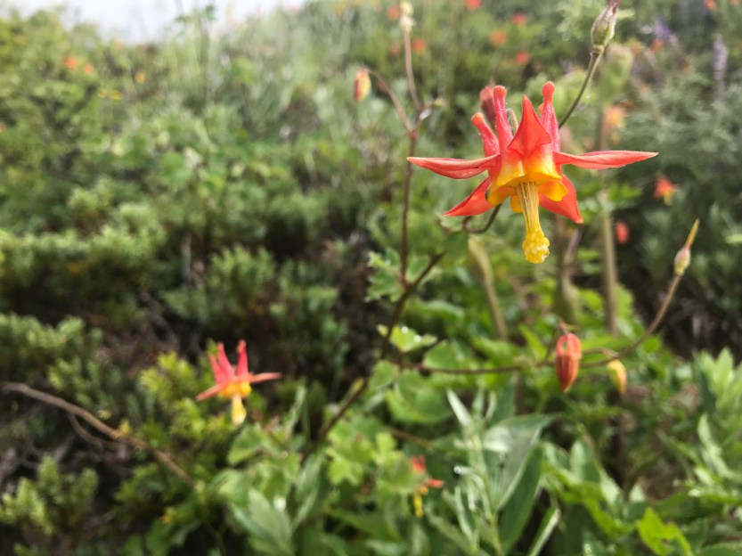 Day 82: 16 miles hiked. We woke up, and Beast made us all some delicious eggs and bacon breakfast wraps. We headed out, and discovered that the cloud that had come in the day before had decided to stay put. We again didn’t get the awesome views we had hoped for, but we were still surrounded by wildflowers everywhere. My ankle really hurt at the start of the day, and I hoped that it would loosen up with time. I could walk just fine when it was flat or uphill, but anytime there was a downhill, I felt shooting pains in my ankle. After a few miles, it was throbbing, and I started to feel very unstable with each step, so I asked Beast to wrap it up in leukotape. The tape helped stabilize me, and the pain subsided a bit. The mosquitoes decided to make an entrance at some point, surrounding us whenever we tried to take a break. Much of the day was spent in clouds with little to no visibility, but they would occasionally lift, to show us the beautiful views of the valleys around us. It was a mentally challenging day overall, but we made slow and steady progress to get to our campsite for the night.