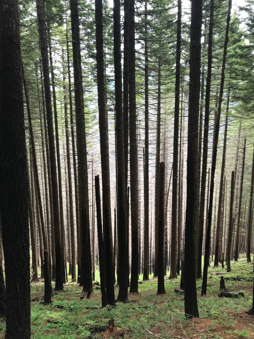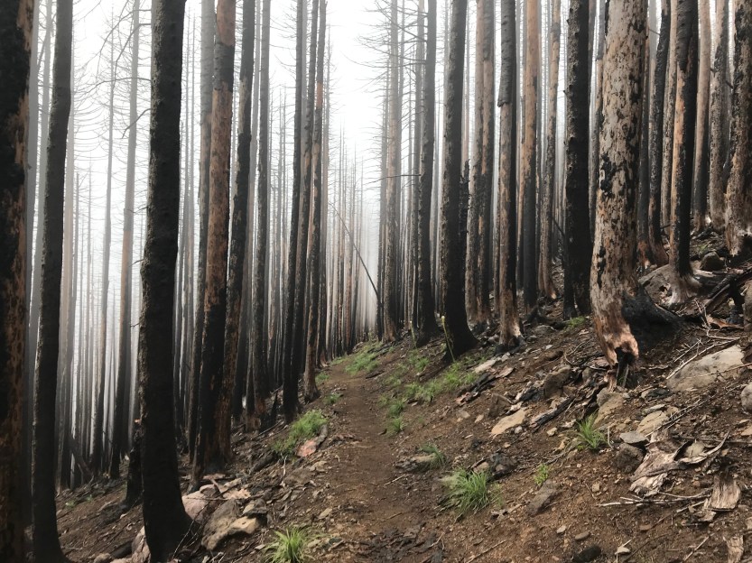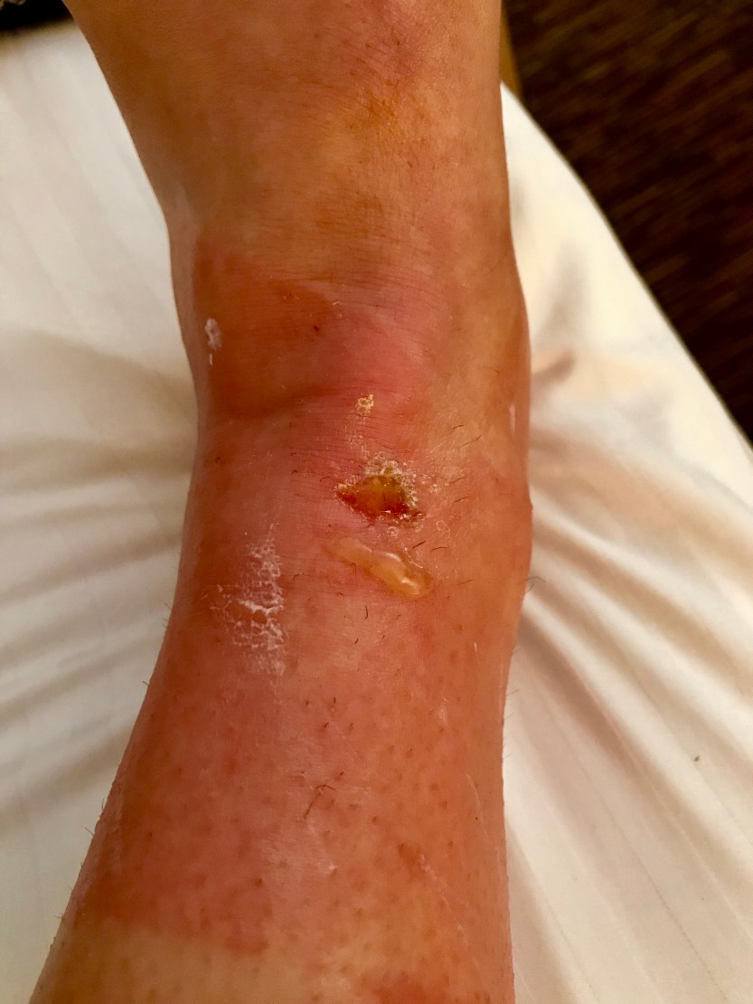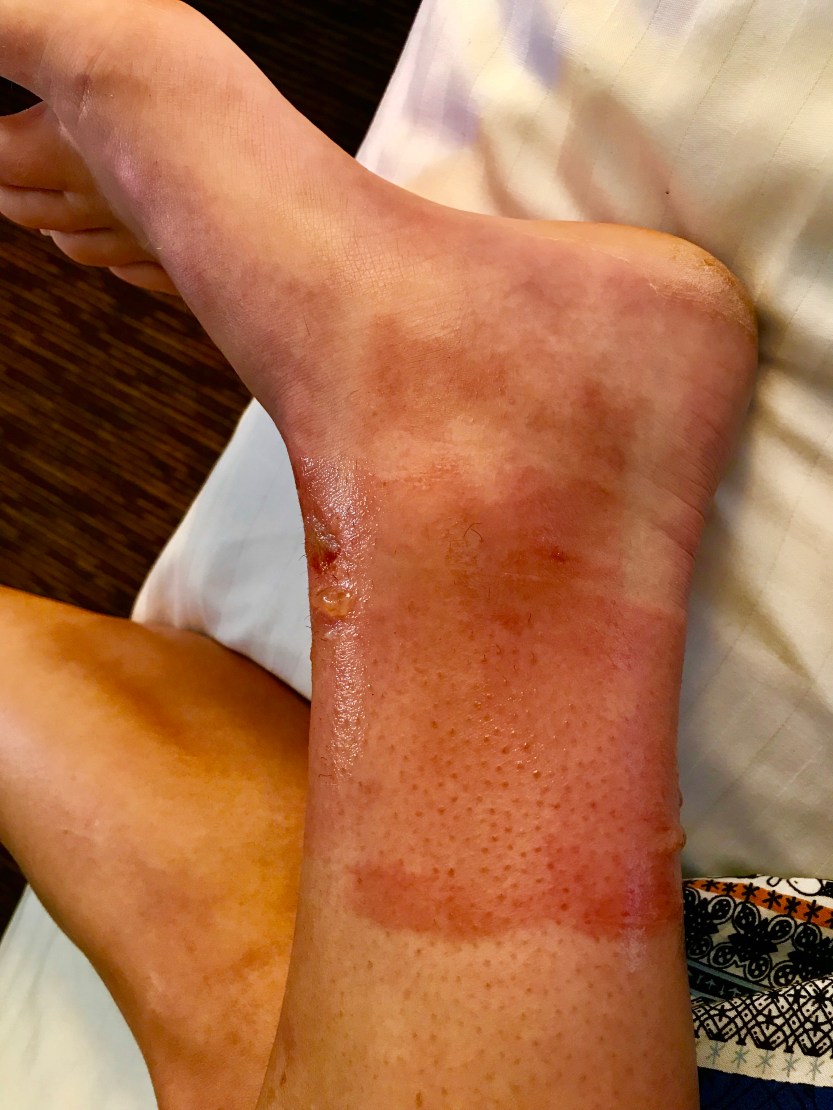 Day 83: 19 miles hiked. When I rolled my ankle 24 days into this journey, I taped it up with leukotape for a week and then wore an ankle brace for another week. A week after this, I got a rash all over it that was at first attributed to poison oak, but was later revised to an allergic reaction. I thought I was allergic to the brace (my skin doesn’t like all clothing materials), and resolved not to use the brace anymore. When I woke up today, it became abundantly clear that I was actually very much allergic to leukotape. My foot and ankle were on fire and itched like crazy. I was 19 miles from town, and I knew I would struggle to walk without my ankle taped because it was going to be on one of the steepest downhills of the whole PCT. I resolved to walk as fast as I possibly with the tape on so I could get to town and tend to it. I left at 7:30am and sprint walked my way to town, taking only breaks to get some water. Most of the day was spent walking through the burn area from the fire that engulfed the Columbia River Gorge in 2017. This fire had been devastating to the area, and while it was sad to see the destruction in such a beautiful area of the country, I was happy to see that things were starting to regrow. It’s really strange walking in a cloud through a snag forest, it’s like you’re walking through the set of a horror movie. As the day went on, the clouds began to clear, and I started to get some beautiful views of the Columbia River. The trail was heading towards its lowest point in elevation for the entire trail. This meant that it was also a lot warmer of a climate, which in turn meant that there were berries that were all actually ripe! I paused on my sprint walk into town to enjoy my first thimbleberries of the season (and a few blackberries too)! With about 8 miles to go, I noticed a few leaves of poison oak on the side of the trail. As I continued down, it only got worse, with poison oak surrounding me and the trail. At first I tried to carefully pick my way along the trail, but it was hard to do that and walk quickly and I really really REALLY wanted to get the leukotape off as soon as possible. I decided to risk it and continue my sprint walk, knowing that I’d be doing laundry and showering within a matter of hours. I got into the town of Cascade Locks, and saw Bridge of the Gods for the first time, which is where the trail crosses the Columbia River into Washington. I had hiked over 19 miles to town in 6 hours with no food breaks, but I got there just in time to have lunch in town! We had decided weeks ago to take a break and zero in Cascade Locks, as we were all exhausted. I made my way to a hiker hangout and began to take the tape off of my ankle. It took me over an hour to do so, as all of my skin had blistered up and it was exceedingly painful and difficult to take the tape off without tearing my skin off as well. I put some pictures at the very bottom of this post to show what my ankle looked like after I got all of the tape off, but I must warn you, they’re really gross. The tape left a red and inflamed rash in its place that itched like crazy. I tried to make it better with some steroid cream, but nothing would take the itch away. I ate some lunch and had a few beers while I waited for the rest of the crew to show up. We got a motel, and I picked up some packages that included some new shoes! I had hiked another 500 miles, so it was time for some new kicks. We hung out in town, got some hotdogs and ice cream for dinner, then called it an early night and went to bed.