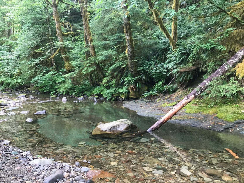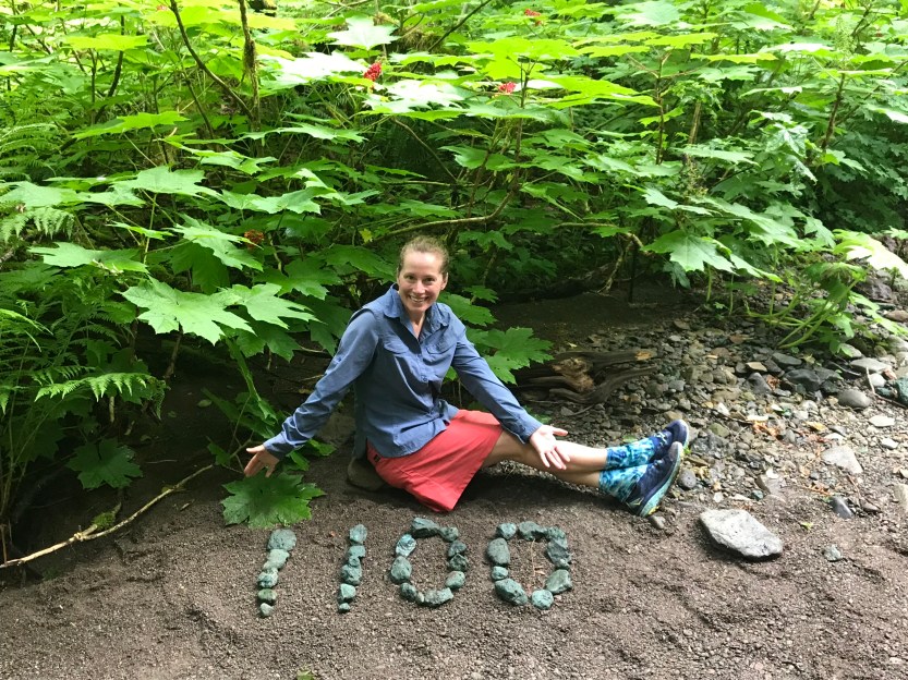 Day 87: 16 miles hiked. We woke up next to a beautiful river and made our 1100 mile marker out of these blue/green rocks that were everywhere. We set out with a goal of 20 miles for the day. As we walked, I was amazed by how green everything was. We were definitely in a rainforest, and the humidity and the density of the woods were imposing. It started to rain again (despite the fact that it was still July and I was still in Washington), and I wondered if I was going to have 2 more months of being rained on everyday because if that was the case, I should just go home. The first 50 miles of the PCT in Washington is quite the roller coaster. You climb and climb and climb and then you get to the top, and you just go straight back down. Then you do it all over again. There are three of these giant uphills before the trail flattens out a bit and you stay at elevation for awhile. Today we went up and over the second of the hills and camped at the base of our last climb, at panther creek. The rain eventually let up, and we were able to see off into the distance. We stopped several times at rivers so that we could get water and so I could soak my ankle in the cold water and try to reduce the swelling. In the afternoon we came upon some trail magic that was left in plastic bin on the side of the trail. In it was a bunch of stuff I couldn’t eat and some tootsie rolls, so I had a tootsie roll, imploring myself mentally to think that this was an excellent way to spend my summer. We stopped short of our original goal, as we were all tired and feeling very low. We hoped that by getting a good nights rest, we’d have more energy in the morning. Thankfully the steroids had kicked in by this point, and my ankle, while still in a lot of pain, was no longer itchy!