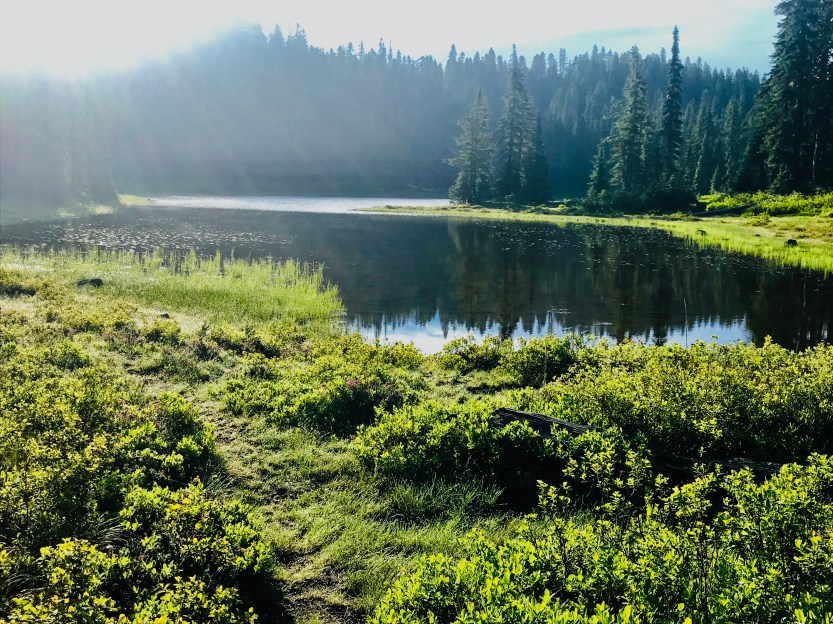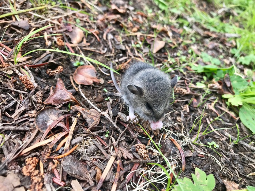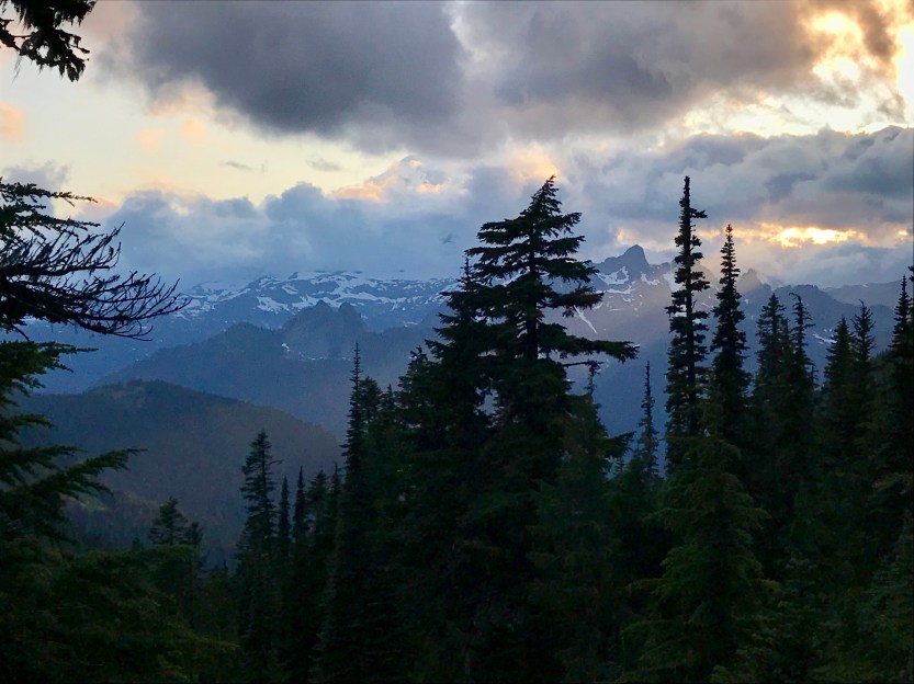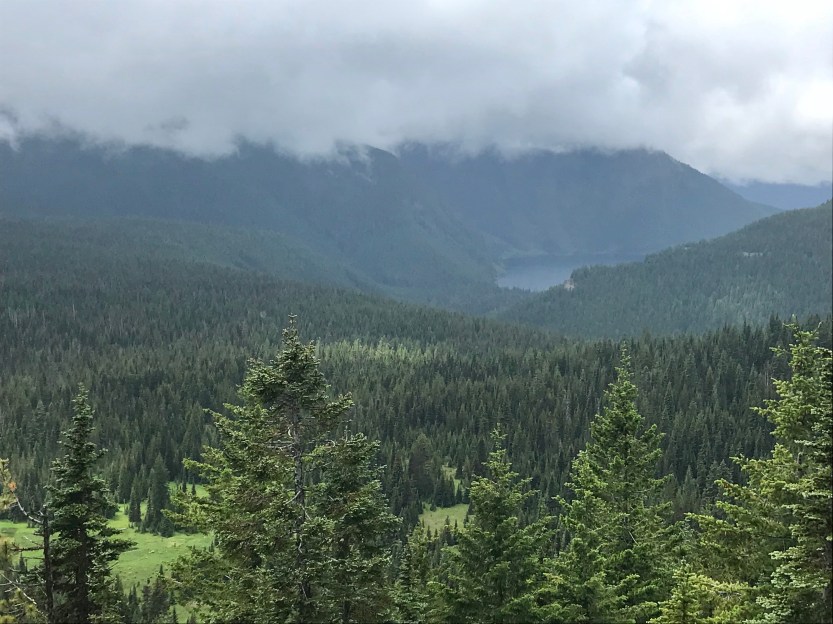 Day 94- 23 miles hiked. We woke up to rain-soaked tents, but no rain! It was cold and foggy, so we made some tea for breakfast and had a slow-moving morning. There were some downed branches all over on the ground around us, and using these, I made a sign to mark 1200 miles, despite the fact that we were now closer to 1250 than 1200. Today’s trail was very muddy, what with all of the recent storms that had just passed through. Thankfully there were many boardwalks, so we were able to keep mostly clean as we passed through. The scenery today was not nearly as stunning as what we had just passed through, and most of the morning was spent in a forest with no epic views. We crossed a river and discovered a baby mouse roaming around at our feet. I think he was blind, as he made no effort to get away from me when I stopped to take his picture. From the river, it was a climb up to the next section of the trail. As I was climbing, I saw Beast up ahead hugging and chatting with someone walking south, as I approached, I realized it was Goose! Goose is/was one of my absolute most favoritist people I met in the desert, and I was beyond excited to see him and catch up. Goose was in the middle of training for a much longer hike (yes, that’s right, the PCT is Goose’s training hike) where he plans to hike all of South, Central, and North America! After chatting for an hour, we hugged and bade him goodbye and good luck! We continued up the hill and were rewarded with some beautiful views all around us. We had entered into Mt. Rainer National Park, but the clouds obscured any views of the Mt. Rainer. Instead, we caught glimpses of the surrounding mountains, and what was likely the base of Rainer. At one-point Beast was in the lead and saw several elk that all scattered almost as soon as he saw them. With this in mind, I took the lead, so that I might get to see some elk too! The sun set, and we were hurrying to get to camp. As I was climbing the last hill for the night, I looked up and saw a mom and baby elk on the trail ahead of me. As soon as I recognized what I saw, they were mid-dash down the mountainside, with their crashing through the trees sounding like thunder. I stopped to take a picture of their tracks, and continued on to get to our stopping point, Dewey Lake, before dark.