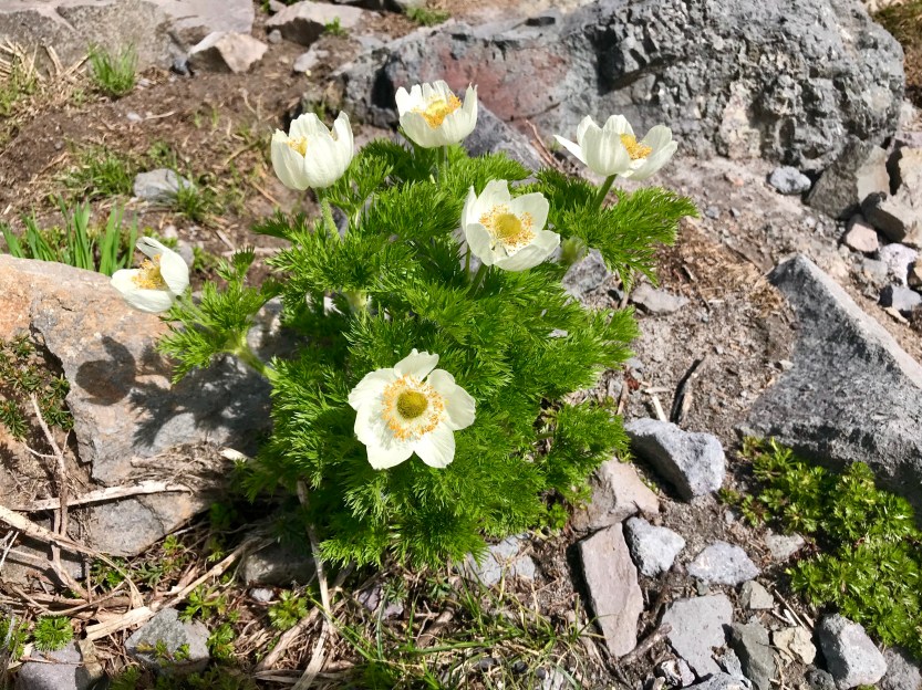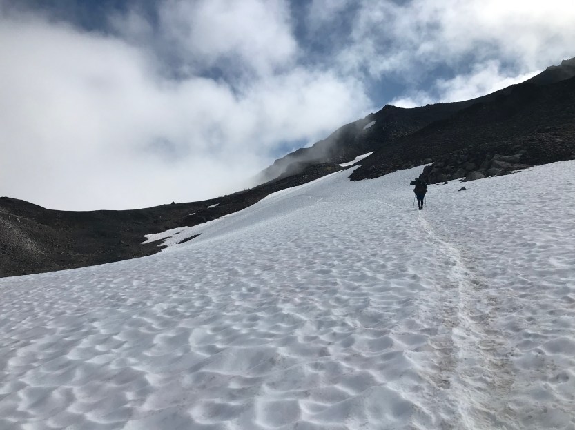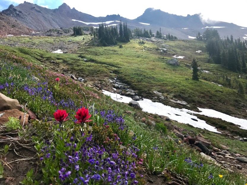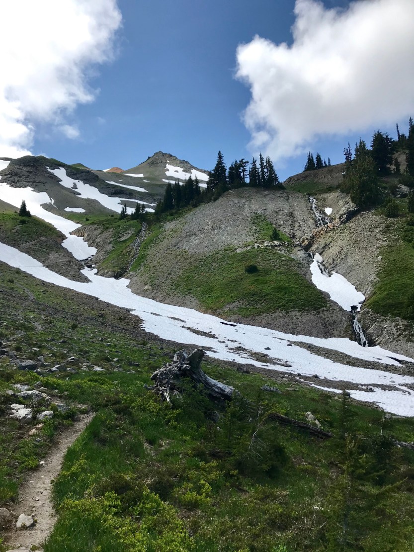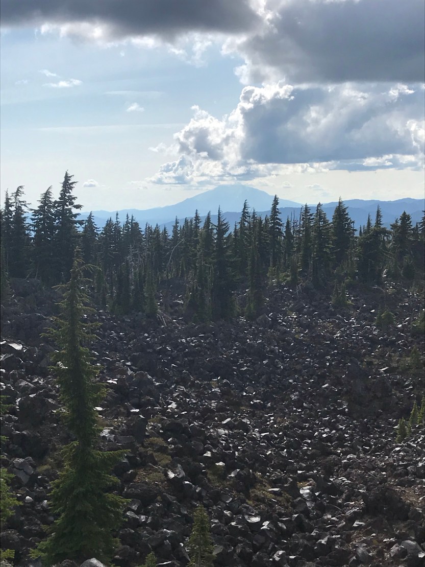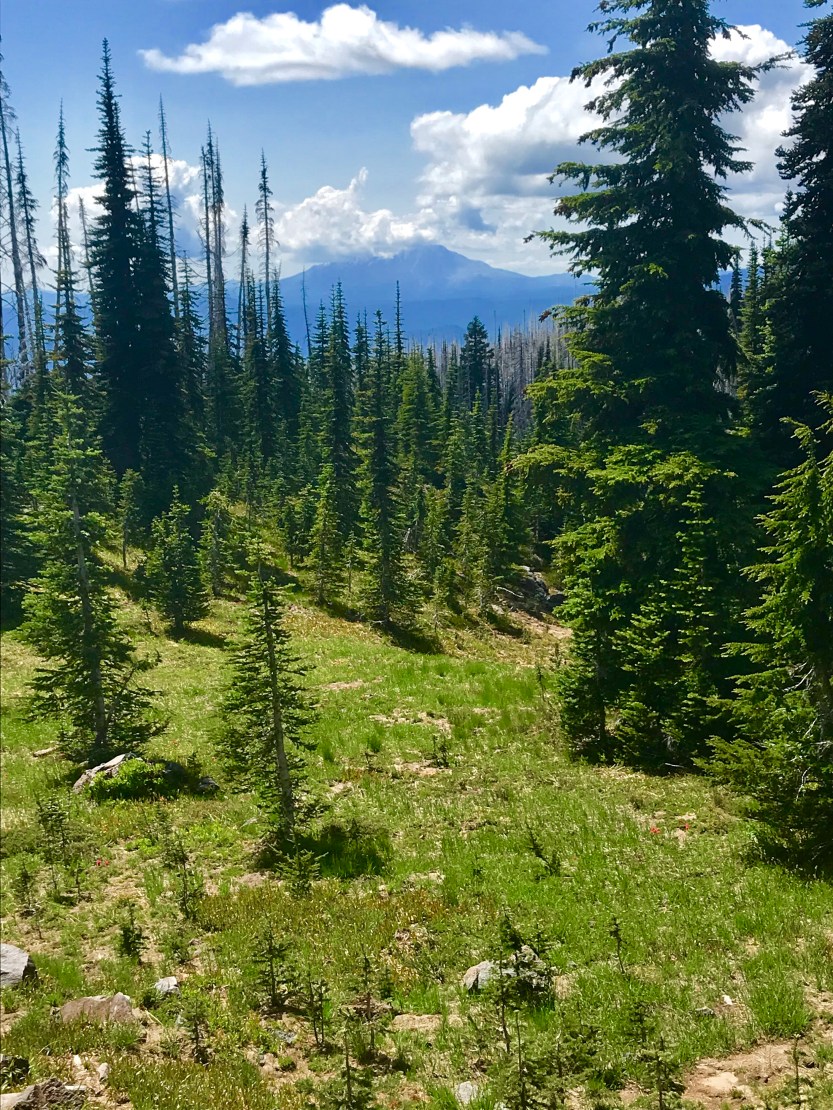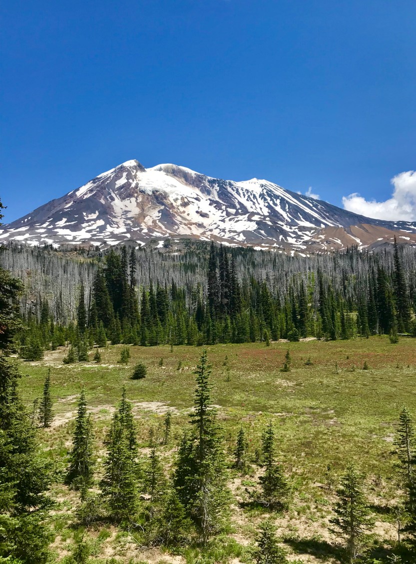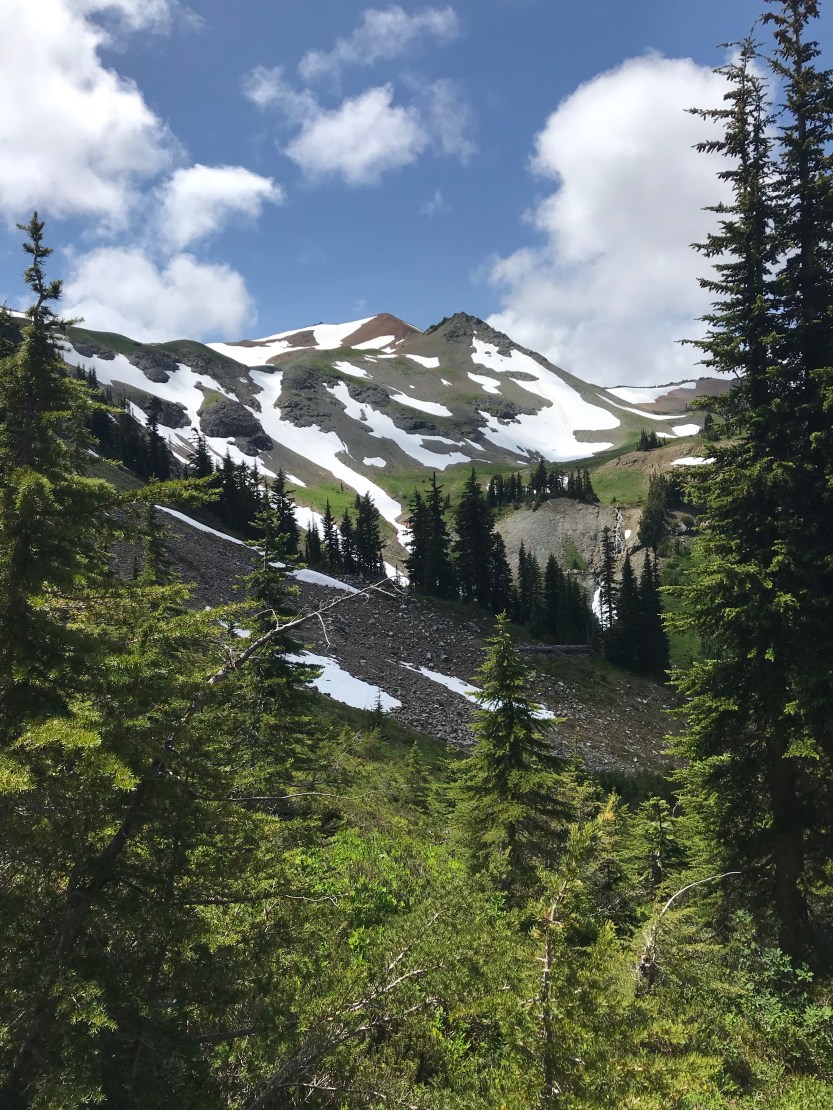 Day 90- 21 miles hiked. Today was just absolutely spectacular. We started out by climbing up towards Mount Adams, and then spent the rest of the day skirting around its base. The sun was out, making the day rather hot, but it also meant that the scenery was just stunning, with blue skies offsetting the greenery that surrounded us. As we hiked, we could alternately see Mount Hood behind us, Mount St. Helens off to our west, and every so often, we’d see Mount Rainer looming in our not so distant future. We passed by many glacier rivers and lava fields, constant reminders that we were, in fact, hiking on a potentially active volcano. The snow had just melted, so there were waterfalls everywhere, and the meadows we walked through were just SO green! We walked through an old burn and it was quite the contrast, with everything being very white. My ankle felt much better with my new brace, as it was rubbing less on my open wounds. I decided I wanted to try and push miles so that I could see my brother in a few days when he had day off from work. We walked until just after nightfall and camped at a spring that was coming directly out of the base of a lava flow (aptly named as lava spring). I went to bed extremely excited for the next couple of days, as we were entering into one of the prettiest parts of Washington, the legendary Goat Rocks!
