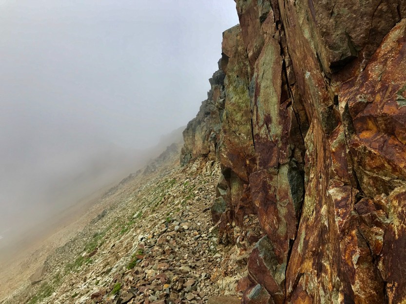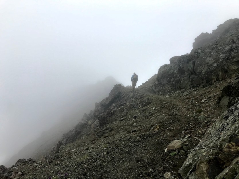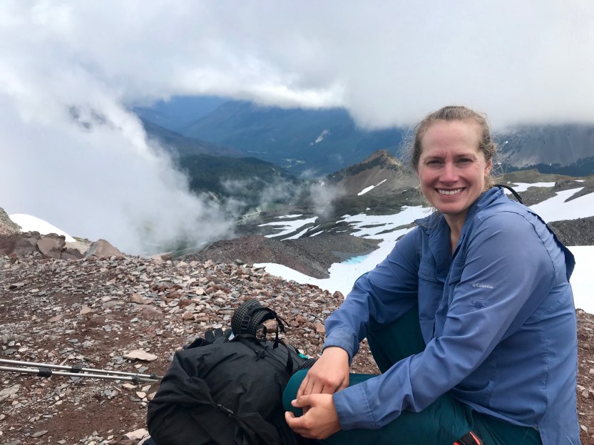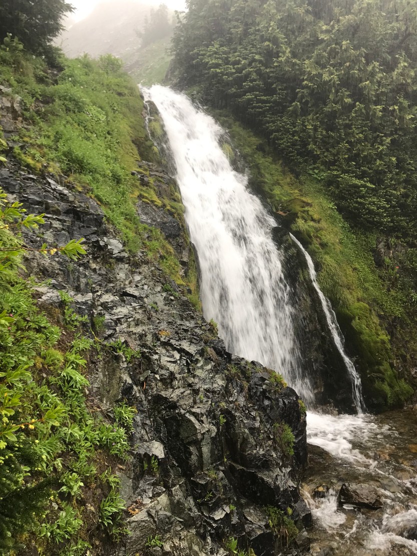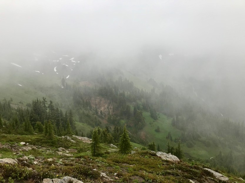 Day 91- 24 miles hiked. I woke up confused, as it sounded like it was pouring rain out. The rain from early Washington had finally cleared up for the last several days, and I naively thought for sure we were done with it, but alas, we were not. I packed up and hoped against all hopes that the rain would clear, since I didn’t want my views of Goat Rocks to be hindered. Unfortunately, my wishes did not come true. It absolutely poured on us all day. At times, it would rain so hard that it hurt my skin to walk in it, and I would have to find a tree to wait under for it to change from torrential to heavy rain. It was a pretty depressing day, and I was absolutely soaked for much of it. I had managed to keep my feet dry, but then about 10 miles into the day, the trail went through a bunch of overgrown bushes. The bushes were also soaked, and they managed to transfer all of that wetness to the inside of my shoes, so my socks were soaked and squishy for the remaining 14 miles. To make matters worse, every time we stopped to take a break, we were swarmed by mosquitos, so we had to keep moving as much as possible. We stopped and ate lunch at our 1200-mile marker, but none of us had the energy to make a sign to celebrate it. The clouds were ever present, but I could make out some scenery off in the distance. We climbed up to Cispus pass, alledgely one of the most beautiful sights on trail, and there was nothing to be seen because we were in a cloud. I was feeling rather low, and the guys hiked on up ahead of me. At this point, my rain gear was saturated, so everything I was wearing underneath my rain jacket and pants was also soaked. Between the cold and wet weather and the wet clothes, I was constantly shivering, so I knew it was important to keep walking in order to keep warm. I passed by a series of waterfalls and rivers. Everything was slick and it didn’t feel safe to try and pick my way across rocks when crossing the rivers, so I just walked straight across the rivers… everything was already soaked, so what difference would it make to wade across a river?