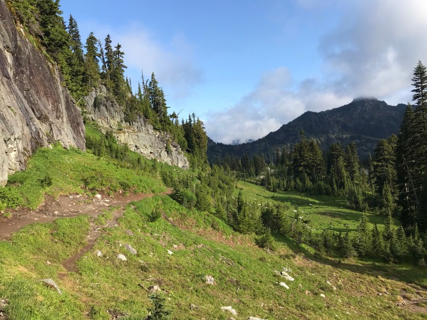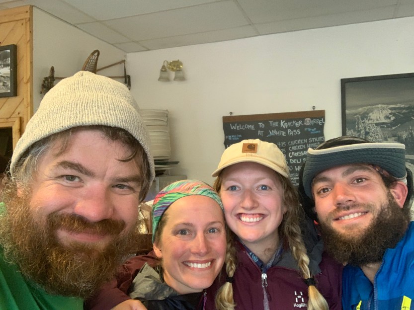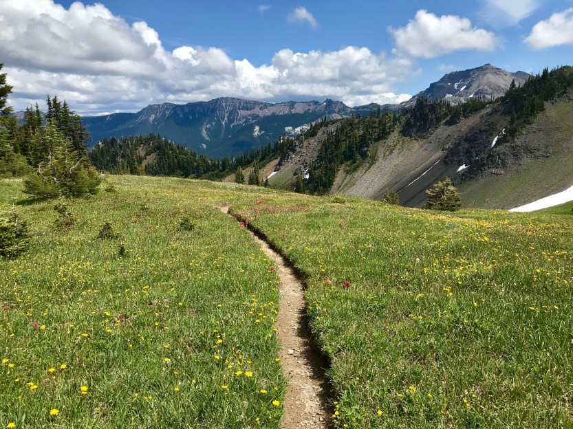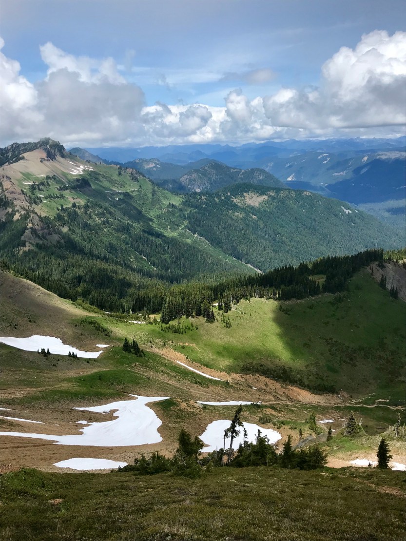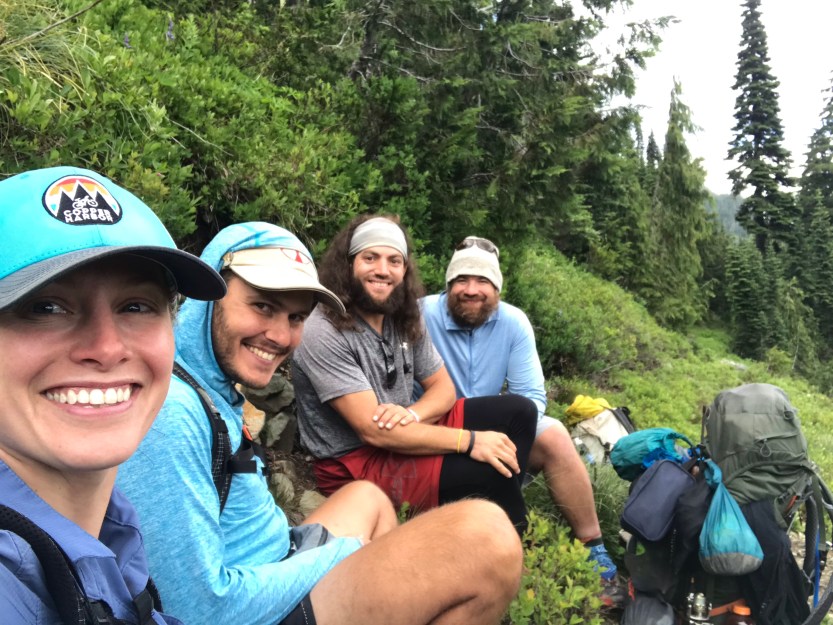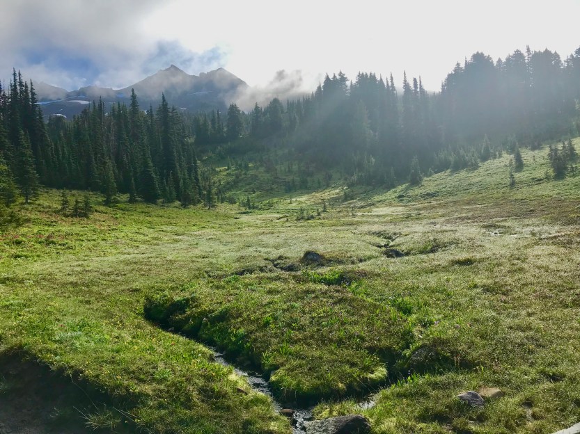 Day 92- 21 miles hiked. The rain stopped sometime during the night, and we woke up to the sun trying to make its way through the clouds. We had apparently slept next to a cliff that had an amazing view of the valley below. I was excited that the weather had cleared up some, and I was hoping that it meant that I would be able to see some of the epic views of Goat Rocks. Packing up today was slow going and hard. My clothes were still soaked from the storm the day before and putting on cold wet stuff first thing in the morning was pretty demoralizing. I left camp before the guys, as it was very cold once I had all my wet clothes on, and I needed to keep warm, which meant moving was essential. I walked in and out of some clouds before making my way to a meadow, full of green grass and flowers. I stopped at a snake-like stream that was cutting its way through the meadow and sat down to get some drinking water. The sun came out, and the warmth and scenery were heavenly. The guys caught up and we happily discussed our change in fortunes. We moved along, and made our way to the Knife’s edge trail, that we had heard so much about from south bound hikers. I struggled with the wet (re: heavy) pack & constant uphill and despite my resolution to not stop on the uphills anymore, I had to pause several times to catch my breath. The scenery was stunning, but it was still mostly obscured by clouds. I could vaguely make out waterfalls in the distance, and I knew I should be able to see Mount Rainer (I could not). We were surrounded by wildflowers, including many that reminded me of Truffula Trees from the Lorax. We climbed up the aptly named Knife’s edge trail, and took a break while hanging out with some south-bounders. At the top of the mountain, we had cell service for the first time since we arrived in Washington, so we called and texted with some of our loved ones before moving on. The trail down the mountain is the reason why it’s named Knife’s Edge. You walk along the top of the mountain ridge, with a steep drop-off on either side of you. At times the trail hugged giant boulders that you had to edge your way around, as there was very little room on the side before another steep drop-off. At this point the clouds began to clear, and it became incredibly difficult to continue walking. Was my ankle still throbbing? Yes. Was I tired? Yes. Was I still soaked and struggling to keep warm? Yes. However, none of these even remotely mattered when the clouds lifted. The scenery that surrounded me was so beyond stunning, I don’t have the words to describe it. I struggled to walk, because every few steps I would have to stop and just take it all in. I was surrounded by mountains, waterfalls, and wildflowers. It literally took my breath away, as I found myself repeatedly stopping and holding my breath while my eyes feasted on the valleys below. It took me forever to get to each of our break points, as I struggled to put one foot in front of the other, knowing that I might never be able to witness such beauty again. I would make a turn around a mountain side and be sad that I wouldn’t see the lakes and scenery again, only to be overwhelmed by the next view in front of me. It was on one of these turns that I ran across a pack of mountain goats, grazing along a cliffside. I wondered if they knew that they had one of the prettiest dining rooms across the world. My brother was picking us up at the end of the day, and that was the only thing that was making me move in any forward fashion. Had he not been there, I don’t think I could’ve been pulled myself away from these mountains. I seriously contemplated what I would have to do in life so that I could never leave this place. I made my way down the mountain and got to the road with just 5 minutes to spare before Jordan arrived to pick us up. Since Jordan had last seen us, he had gotten a new car. In preparation for picking up us three stinky and filthy hikers, he laid towels and sheets all across any surface that we, or our things might touch… apparently, he didn’t want our stench and filth to seep into his brand-new car surfaces! We went into the town of Packwood and got some pizza and beers. From there, we went to our Airbnb and hung up everything we owned, as it was all soaked, and did chores for the rest of the night, in the warmth of the indoors.