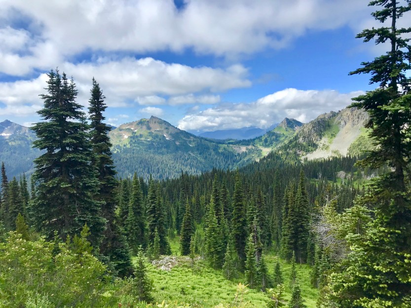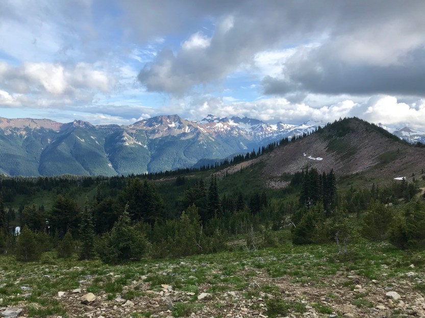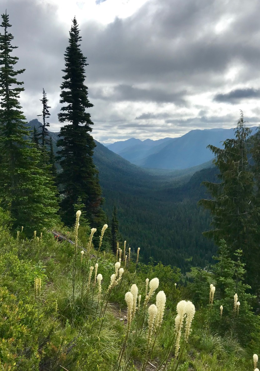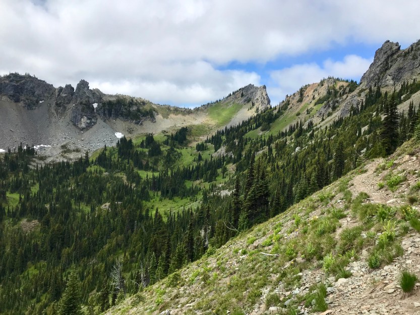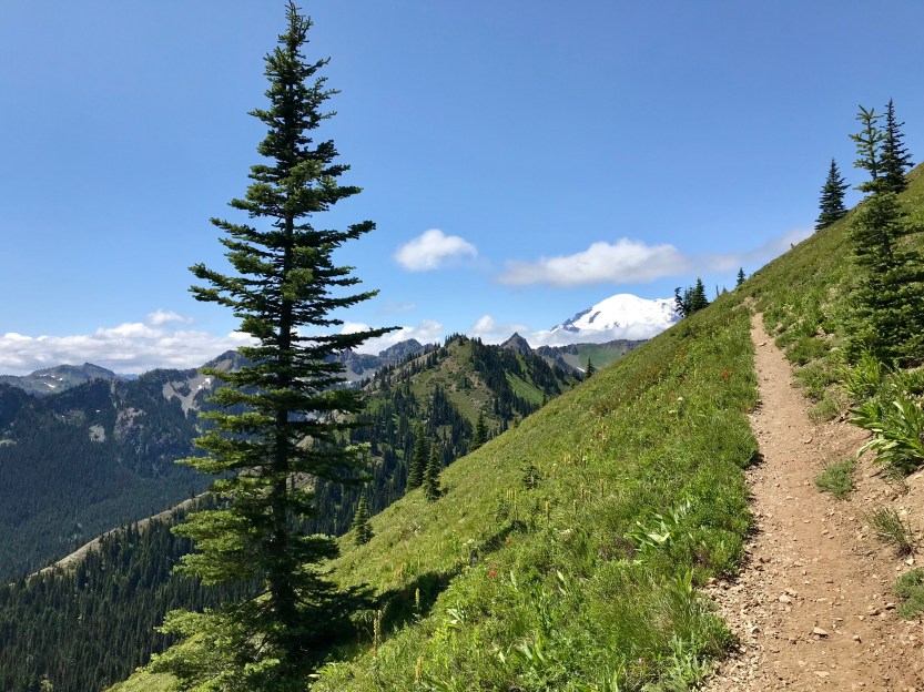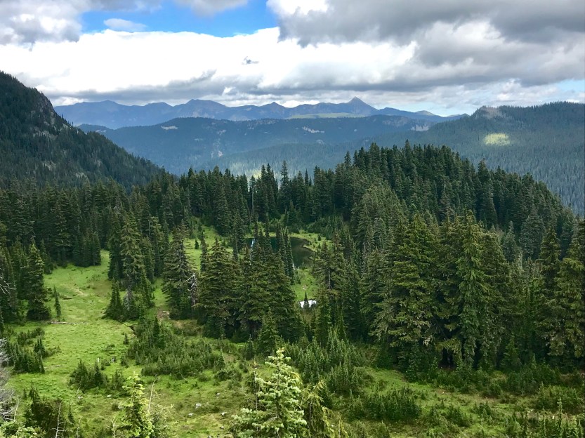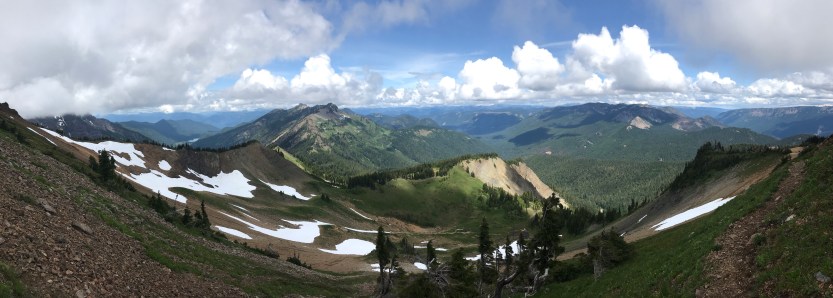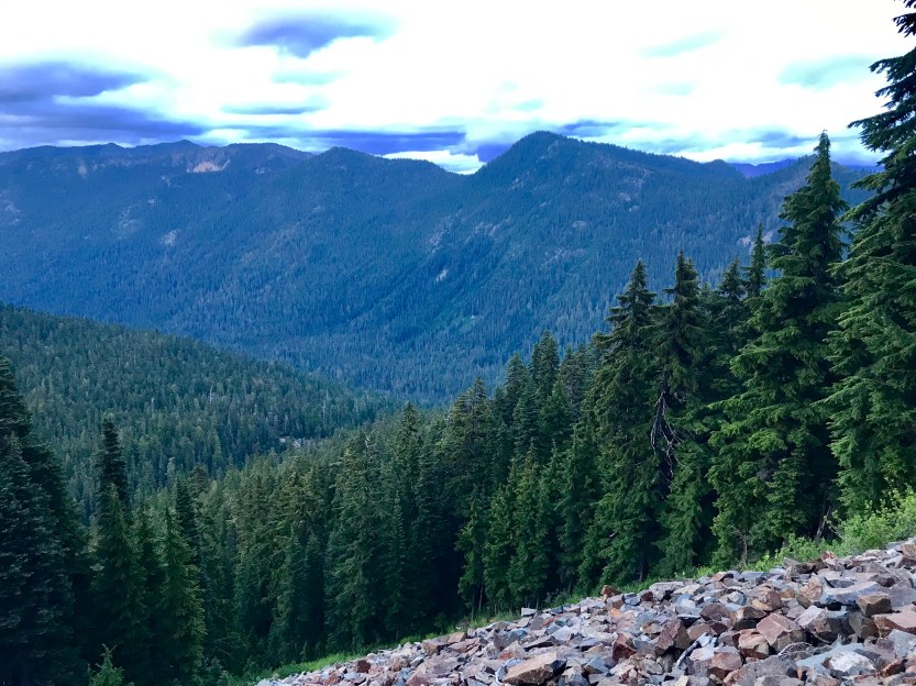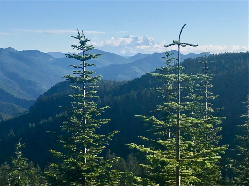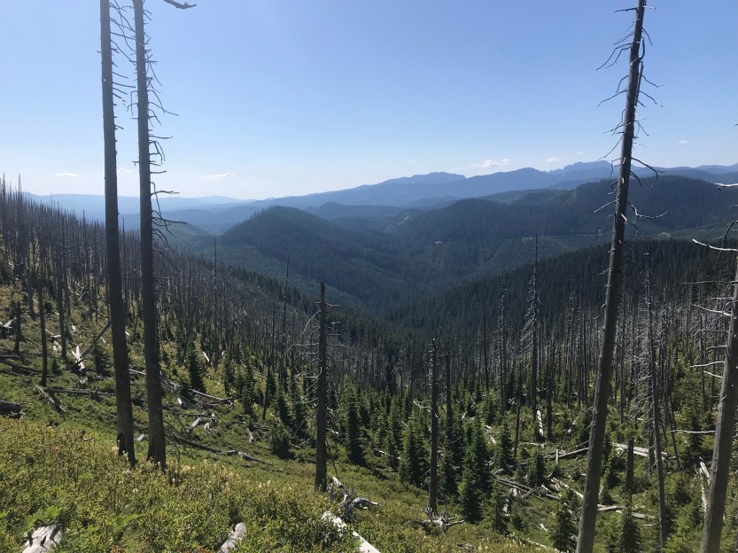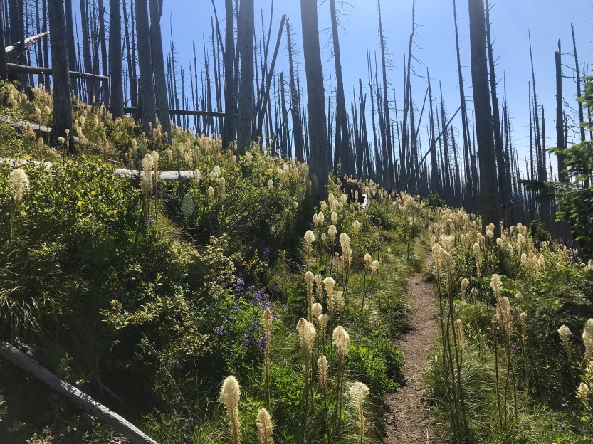 Day 96- 24 miles hiked. It was so nice waking up in a warm and dry building and not having to pack up damp things. Despite this, I hadn’t slept well the night before, as I had started to feel like I was running a fever. I blamed the warmth of the building and headed out in the hopes that I would start feeling better once I got some fresh air. Today was filled with a lot of ridge running through some heavy burn areas. Mount Rainer was every present in the background as we walked, and the absence of clouds today made it even more prominent and striking. The lack of trees meant that there was bear grass everywhere. I continued to feel pretty terrible, and started to get concerned, since my foot was still oozing from my burst blisters and looked like they were infected. Prior to getting on trail, I went to my doctor to get some precautionary medicine (antibiotics for common issues that might come up on trail) and she gave me a rundown on what I should look for and be concerned about. Given that my foot looked infected, and I felt like I had a low-grade fever, I decided the best course of action would be to start taking some antibiotics as a precaution, just in case I did actually have a fever from my foot. I had to a break every 20 minutes or so to rest, hiking while sick is no fun! It was a really slow-going day with beautiful views along a valley we were walking along. At some point, two fighter jets zoomed overhead and scared the crap out of me! The noise they made was deafening, as they were practicing their flying skills through the mountains I was hiking along. This was to be a regular occurrence from here on out, and a few times they flew so close that I could see the pilot as they flew past (a video is below of the noise after they flew by, but I was too slow to get the planes in the frame). The southbound group on the trail had been steadily growing, and today it reached its peak. Beast and I had to stop on the top of a hill and wait for five minutes as the southbounders made their way up (people hiking uphill have the right-of-way and proper etiquette is to yield to them). I’ve never been stopped in a more frustrating traffic jam… I’m hiking in the woods afterall!