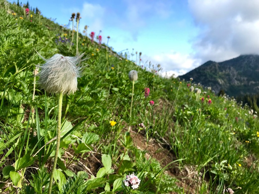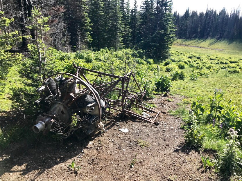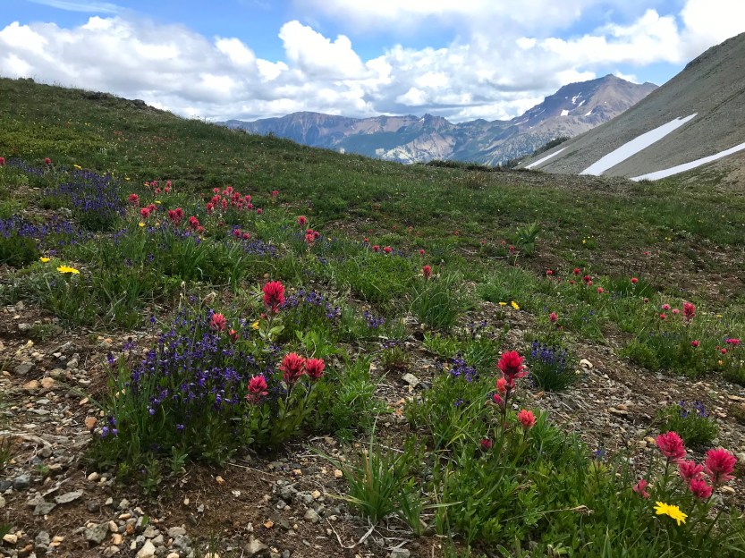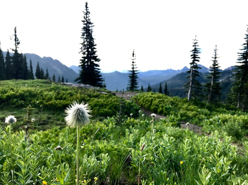 Day 95-26.4 (new PR) miles hiked. We woke up with a little over a marathon between us and a shelter that we could sleep in. We were all tired of our tents and the condensation associated with sleeping in them, so we were extra motivated to get to the shelter for bed. I left well before the guys, as I was super motivated to get to Chinook Pass (a mere 3 miles away), where there were trash cans, pit toilets, and a parking lot where we might get some trail magic. The morning views were beautiful, with my favorite Truffula Trees everywhere. I love these seedheads, because they all look like a person that’s having an epically bad hair day, which, as a person who was showering once every 3-5 days, I genuinely appreciated. At one point, I passed by a group of boy scouts. They asked me where I was headed and I replied “Canada” and they all began to laugh, thinking that my ridiculous answer was actually a joke. I then said I was serious, and that I had already done over 1200 miles and was now only about 300 miles away from the border. They stopped laughing, and their faces turned to incredulity, and I sensed that some might have thought I was lying to them. As we parted ways, some mumbled “good luck”. Beast caught up to me right as we were reaching the highway. I asked how his morning was going, and he said he got stopped by a bunch of boy scouts that were asking him if he was going to Canada and had a bunch of follow up questions. 🤣 We made our way to the parking lot right outside the entrance to Mt. Rainer NP, and we got to cleaning out our packs of all of our trash. We were approached by someone who asked if we were PCTers. Her name was Sloth, and she had attempted the John Muir Trail this summer (the JMT is 200+ miles through the Sierras), but had to stop because the snow was too dangerous. She changed her plans into road tripping along the PCT and was giving away all her hiking food to hikers she met along the way. We snacked on some goldfish and fruit snacks while chatting, and eventually parted ways. From Chinook Pass, we had a steep four-mile climb ahead of us. We got to the top, and found an amazing view of the valleys around us. We had some weak cell service, and the guys walked ahead while I tried desperately to download some new podcasts. I eventually gave up, and walked along ridgeline after ridgeline with beautiful views all around. I rounded a corner and was taken aback by the view of Mount Rainer that was right in front of me. I had no idea it was looming so close, as I hadn’t seen it in several days. The way it was jutting out from everything else was shocking to see! I caught up to the guys, who had found a sunny spot for lunch that was right across the valley from a ski hill. The ski hill had excellent cell service, and I downloaded many weeks’ worth of podcasts, knowing that this might be my last chance to get some new listening material before getting to Canada. We packed up and headed onward through a recent fire. There were lupins everywhere, and I got left behind to take all the flower pictures I wanted. The trail went along ridges that gave you views for miles. There were beautiful flowers everywhere, including many thistles that were taller than me! I had been hiking on my own for several hours, when I came upon a fork in the trail. I read the different comments on what was around the spot, and discovered that there were remains from a crashed airplane not too far off the PCT. I could not pass that up, and went on the detour to find the rusted body in a nearby meadow. It looked pretty old, and had someone not told me it was an airplane, I would’ve never otherwise known. I made my way back to the PCT, and continued through these amazing lupin meadows. It was really hard to walk, as the flowers were absolutely beautiful. I guess that’s one positive of constant rain… entire seas of flowers! As the sun set, I finally trudged into camp, and we had all made it to the shelter. In doing so, we set a new PR, beating our last one of 26.2 miles by a whopping 0.2 miles. The PCT does not have many shelters along the way, and I was extremely excited to sleep indoors. We got a fire going, and we were all warm and cozy. We met up with another one of our friends from our snow day in the desert, Spench, and got caught up on his southbound journey. He had a new hiking partner, and the 5 of us, plus one stranger all squeezed together to sleep in the loft (where we hoped the mice would leave us alone).