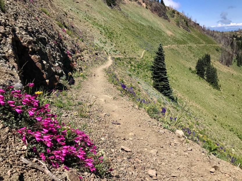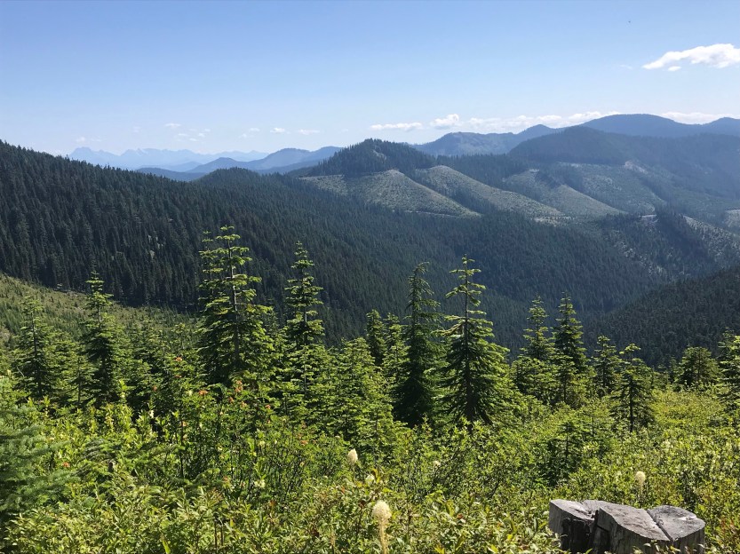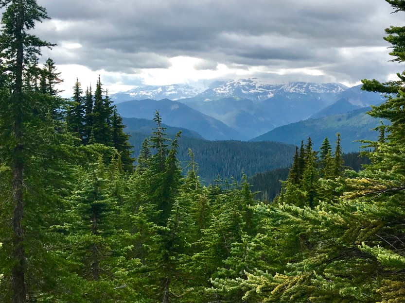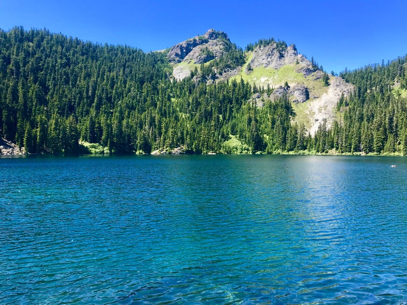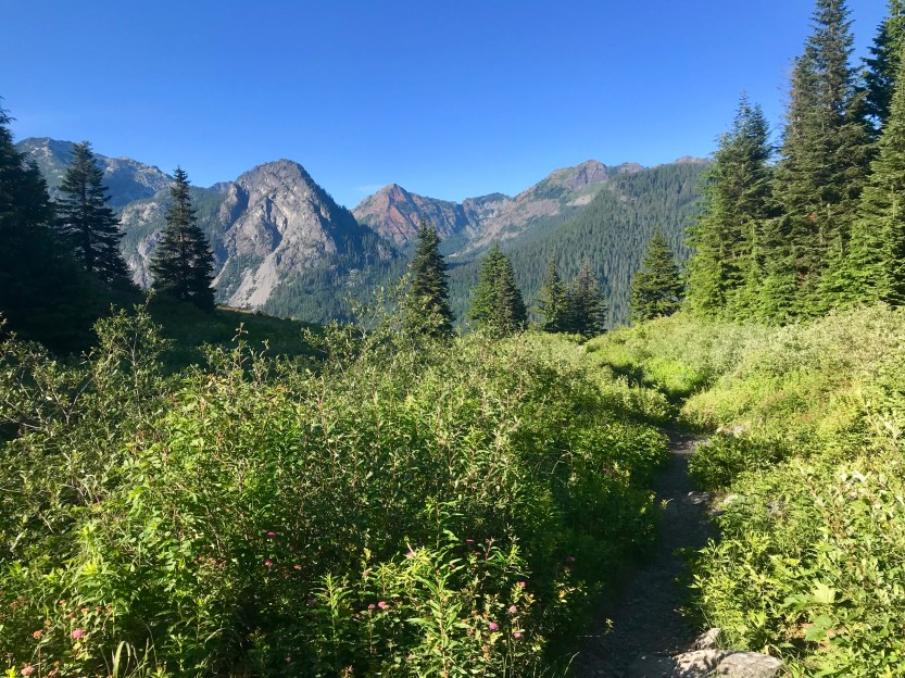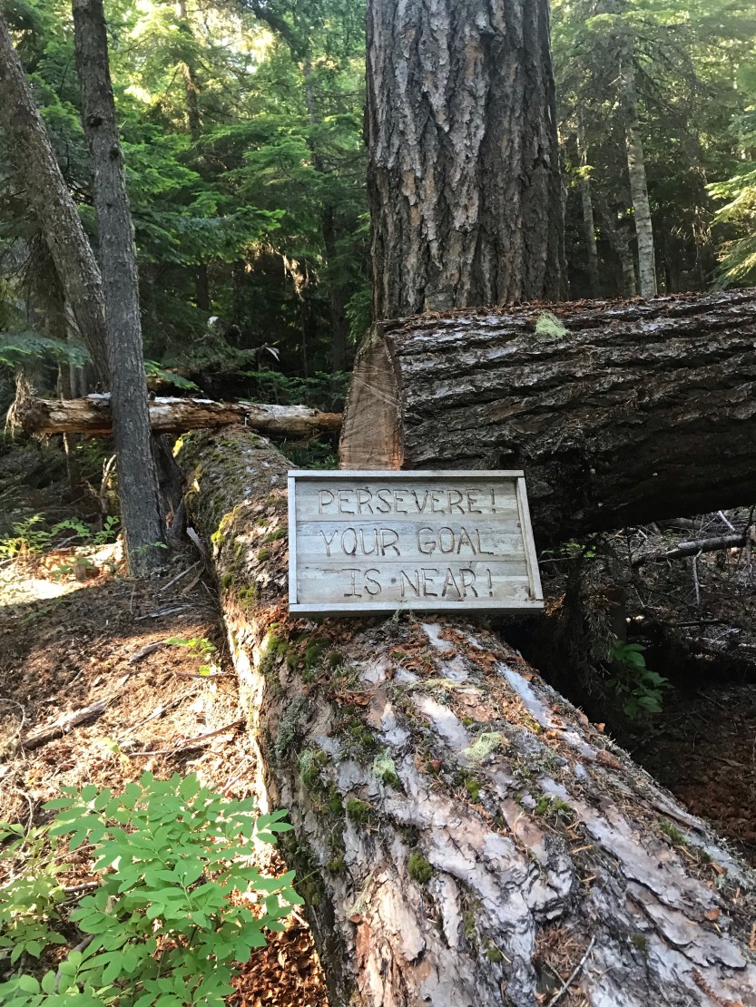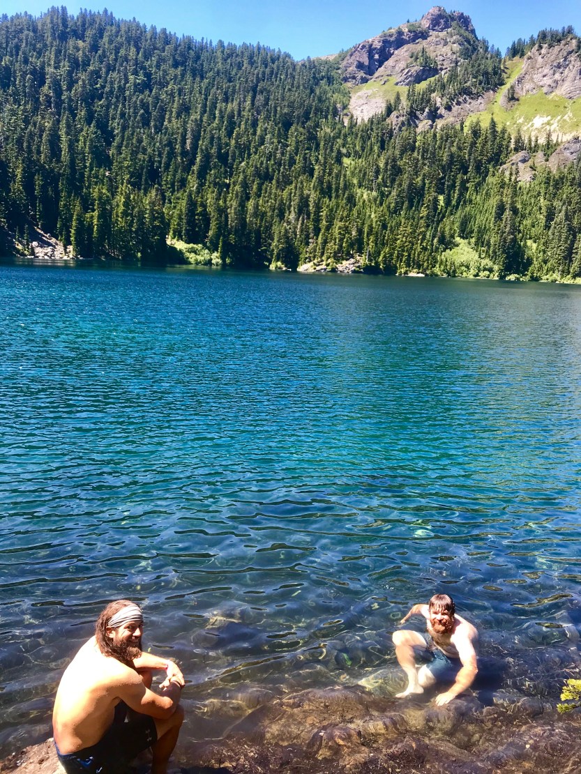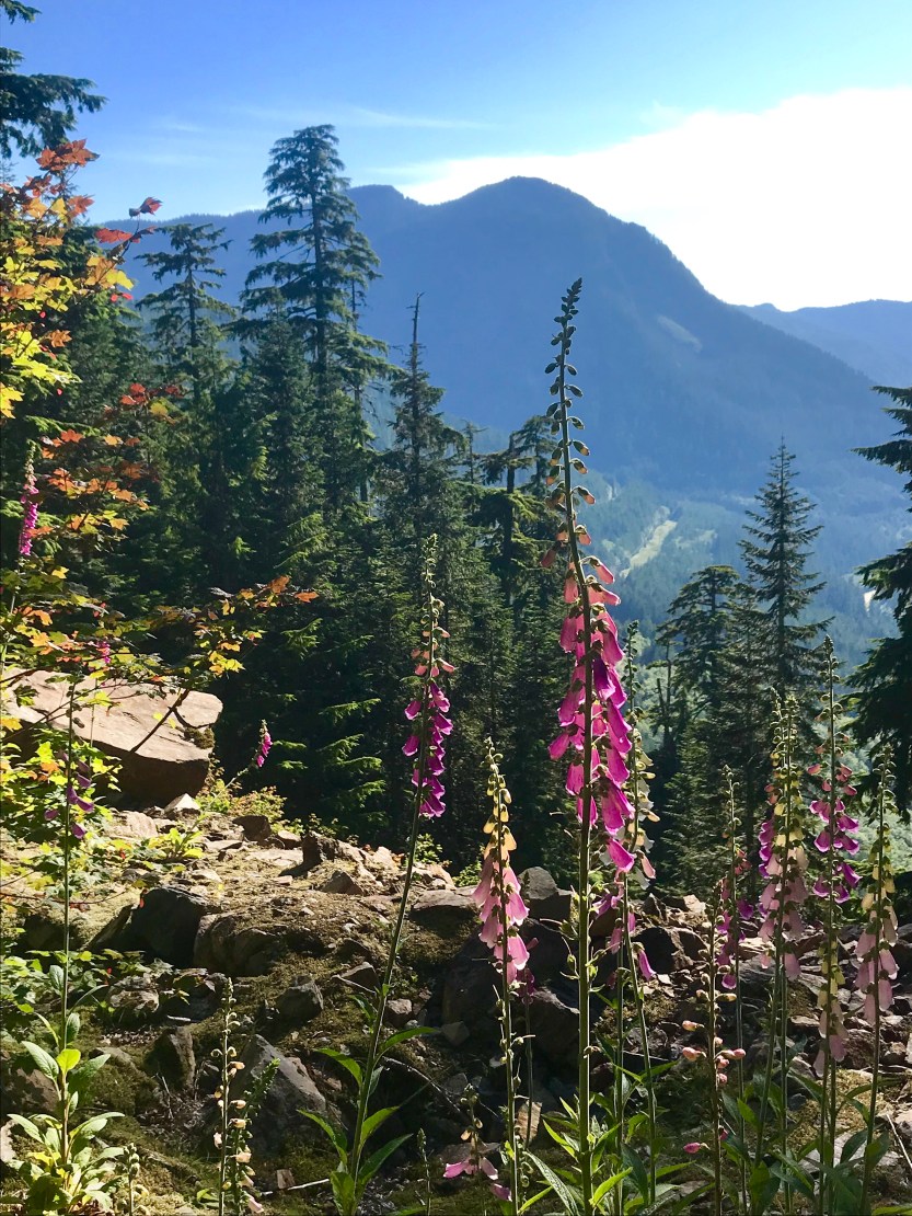 Day 97- 22 miles hiked. We got up early with the anticipation of getting into town by the end of the day. The trail was very wet today, and we walked passed several waterfalls that went across and along the trail. I also started to see giant mushrooms everywhere. It was a very hot day, and we were determined to get to Mirror Lake for lunch so that we could take a dip in the water. The trail continued to be very crowded, and when we got to the lake, we were surrounded by people. Evidently, this is a popular day hike with the locals, so there were a bunch of people hanging out at the lake (it was also apparently the weekend). We stripped off our stinky clothes and dove straight in and it was beyond refreshing! The lake was a beautiful blue! We ate lunch, and then made our 1,300-mile sign by writing it in some charcoal on a log. We continued on and made our way towards Snoqualmie Pass. We continued to be surrounded by southbounders, and were excited for the southbound bubble to die down. After several hours, we finally were able to see the pass from afar. As we walked, I continually checked my phone to see where we were, knowing that we were going to hit the halfway mark at any moment. When we finally got to 1326 miles, I called out to Savior and Beast, and we all did a cheer mid-stride, but kept on walking, with a celebratory beer ever present in our minds. As we got closer to town, we were surrounded by foxglove, both purple and white. It was beautiful to see, and the pass below was also stunning. We walked through several rivers before finally getting to the top of Snoqualmie ski hill. We walked along the ski runs, and then finally made our way down into the tiny ski town of Snoqualmie Pass. We checked into a hotel for the night, and made our way to the hotel restaurant where we bought a round of drinks to celebrate our accomplishment of making it halfway! I still wasn’t feeling great, although my fever had lessened. Regardless, I couldn’t pass up a halfway there beer! Snoqualmie also lies almost exactly halfway through Washington, so we talked about how we were almost done with another state as well. The guys were going to leave me behind here so that I could walk with my brother, so we also made plans on how we were going to meet up at the next stop in a few days. All in all it was a celebration, and we were all so excited to have made it this far!