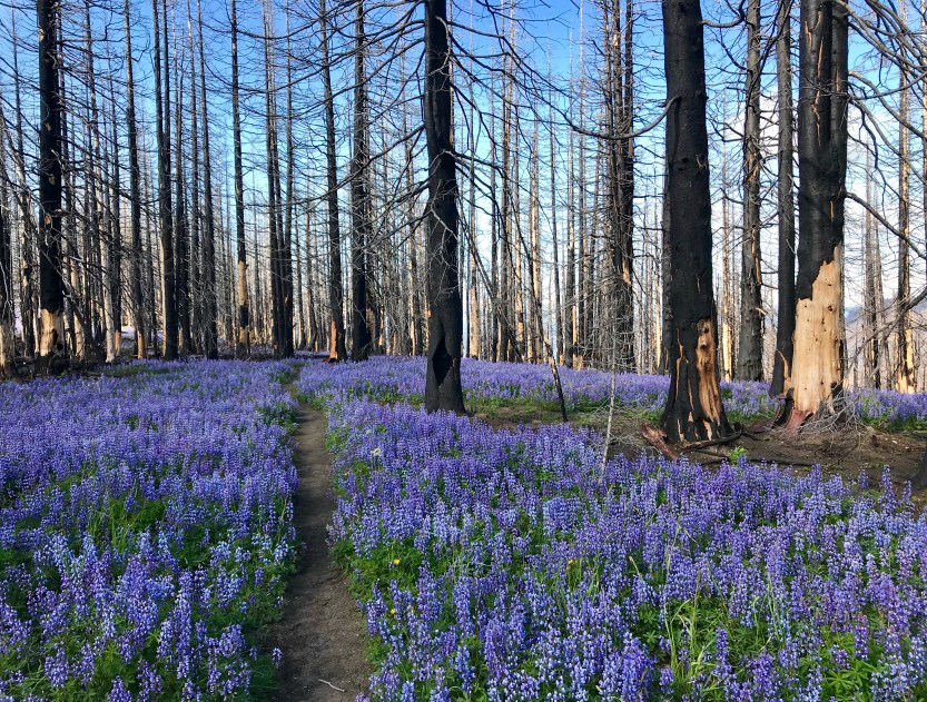 Day 90- 21 miles hiked. Today was just absolutely spectacular. We started out by climbing up towards Mount Adams, and then spent the rest of the day skirting around its base. The sun was out, making the day rather hot, but it also meant that the scenery was just stunning, with blue skies offsetting the greenery that surrounded us. As we hiked, we could alternately see Mount Hood behind us, Mount St. Helens off to our west, and every so often, we’d see Mount Rainer looming in our not so distant future. We passed by many glacier rivers and lava fields, constant reminders that we were, in fact, hiking on a potentially active volcano. The snow had just melted, so there were waterfalls everywhere, and the meadows we walked through were just SO green! We walked through an old burn and it was quite the contrast, with everything being very white. My ankle felt much better with my new brace, as it was rubbing less on my open wounds. I decided I wanted to try and push miles so that I could see my brother in a few days when he had day off from work. We walked until just after nightfall and camped at a spring that was coming directly out of the base of a lava flow (aptly named as lava spring). I went to bed extremely excited for the next couple of days, as we were entering into one of the prettiest parts of Washington, the legendary Goat Rocks!